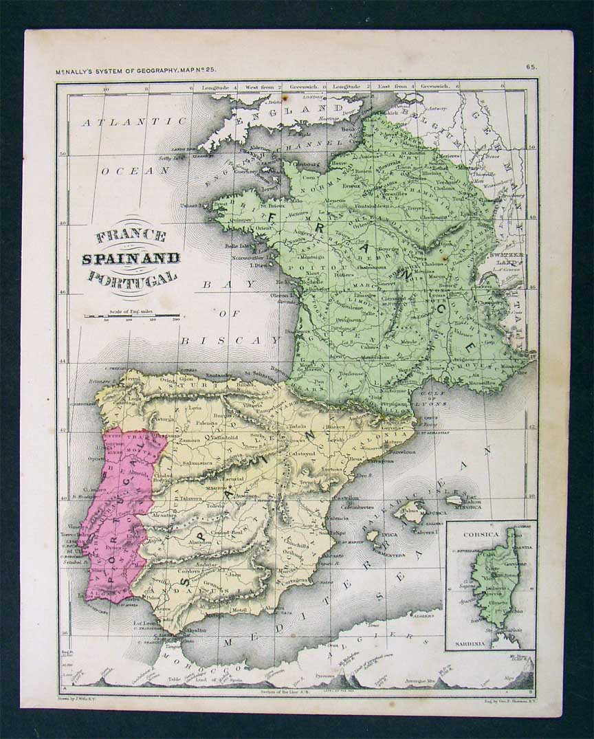 1857 McNally Map Spain Portugal France Corsica Madrid