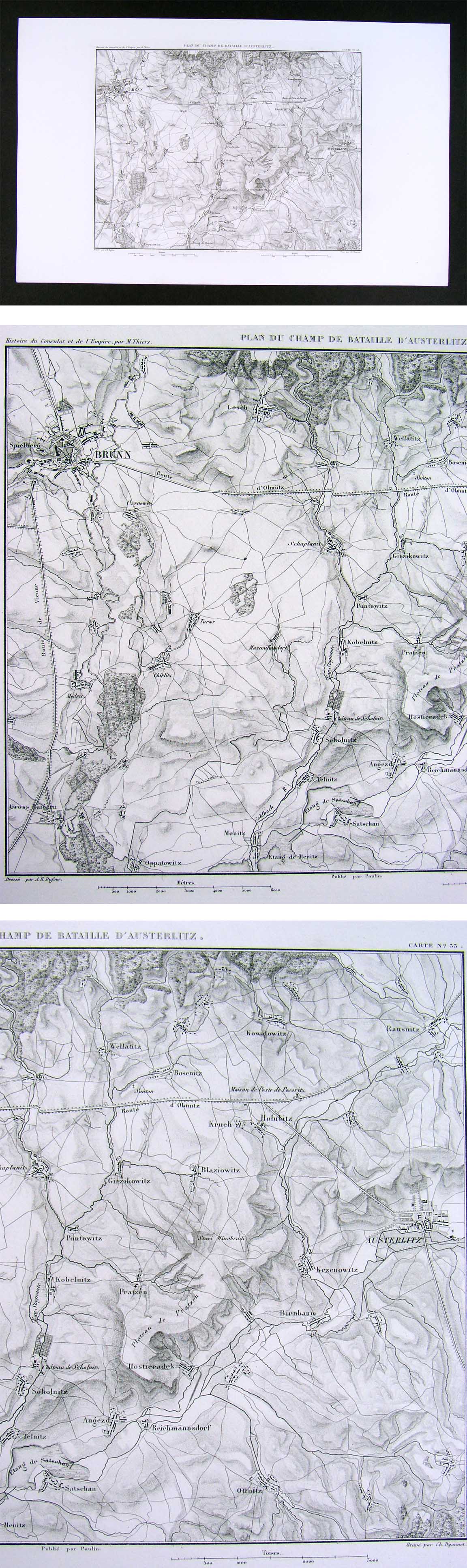 Description:  It is an original engraved antique map in excellent condition with the plate mark indentions clearly shown in the margins. It is designed by A.H. Dufour and was published in M.A. Thiers' Atlas de L'Histoire du Consulat et de L'Empire (Paris: Paulin, 1859).  The map itself is well documented on the map: the title of the atlas appears in the upper left margin, the title of the map in the top center, the plate number in the upper right, the designer Dufour's name in the bottom left, the publisher Paulin's name in bottom center and the engraver Dyonnet in the bottom right. A copy of the title page with the date is also included for authenticity.  This series of maps were designed to illustrate the terrain of the battles of the Napoleonic campaigns.  They are very detailed in terms of the topography and are generally focused on a particular region, battlefield or campaign, although military positions are generally not shown. It is not matted nor mounted, being sold as a single individual sheet as seen in the main pic. It is very early in date for this degree of detail, published without a centerfold: usually they were folded in half for some editions, so it is exceptionally nice for framing.