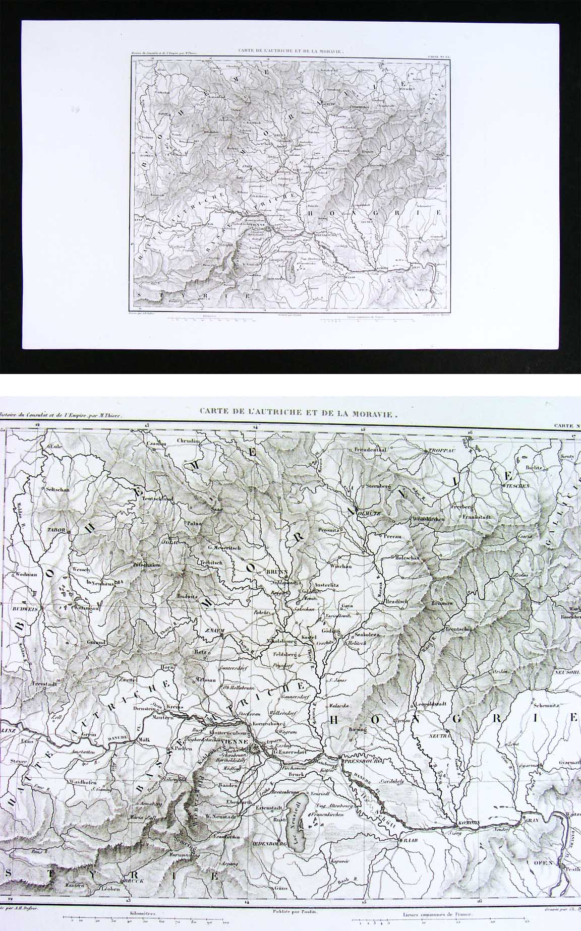 Description: It is an original engraved antique map in excellent condition with the plate mark indentions clearly shown in the margins. It is designed by A.H. Dufour and was published in M.A. Thiers' Atlas de L'Histoire du Consulat et de L'Empire (Paris: Paulin, 1859). The map itself is well documented on the map: the title of the atlas appears in the upper left margin, the title of the map in the top center, the plate number in the upper right, the designer Dufour's name in the bottom left, the publisher Paulin's name in bottom center and the engraver Dyonnet in the bottom right. A copy of the title page with the date is also included for authenticity. This series of maps were designed to illustrate the terrain of the battles of the Napoleonic campaigns. They are very detailed in terms of the topography and are generally focused on a particular region, battlefield or campaign, although military positions are generally not shown. It is not matted nor mounted, being sold as a single individual sheet as seen in the main pic. It is very early in date for this degree of detail, published without a centerfold: usually they were folded in half for some editions, so it is exceptionally nice for framing.