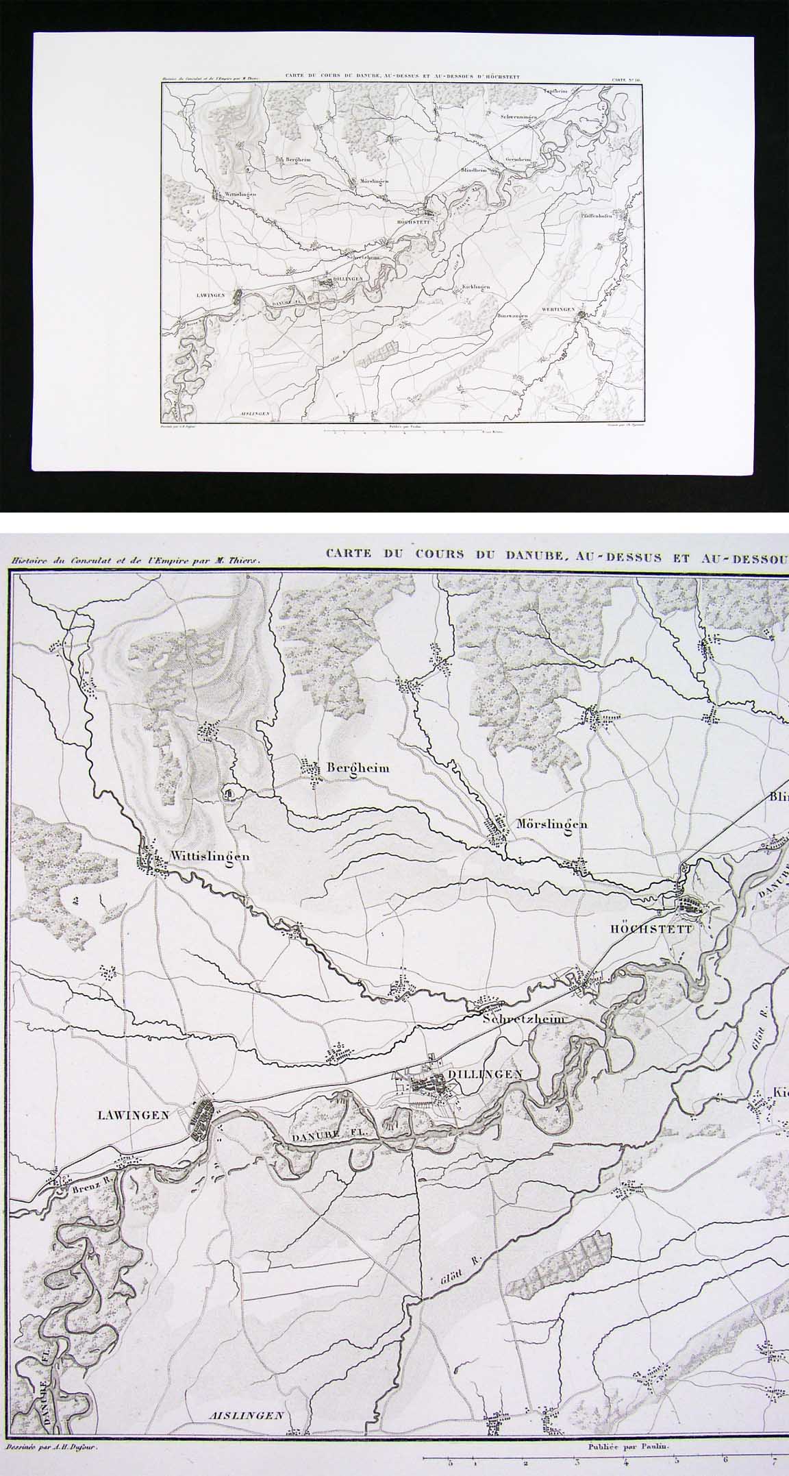 Description:  It is an original engraved antique map in excellent condition with the plate mark indentions clearly shown in the margins. It is designed by A.H. Dufour and was published in M.A. Thiers' Atlas de L'Histoire du Consulat et de L'Empire (Paris: Paulin, 1859).  The map itself is well documented on the map: the title of the atlas appears in the upper left margin, the title of the map in the top center, the plate number in the upper right, the designer Dufour's name in the bottom left, the publisher Paulin's name in bottom center and the engraver Dyonnet in the bottom right. A copy of the title page with the date is also included for authenticity.  This series of maps were designed to illustrate the terrain of the battles of the Napoleonic campaigns.  They are very detailed in terms of the topography and are generally focused on a particular region, battlefield or campaign, although military positions are generally not shown. It is not matted nor mounted, being sold as a single individual sheet as seen in the main pic. It is very early in date for this degree of detail, published without a centerfold: usually they were folded in half for some editions, so it is exceptionally nice for framing.