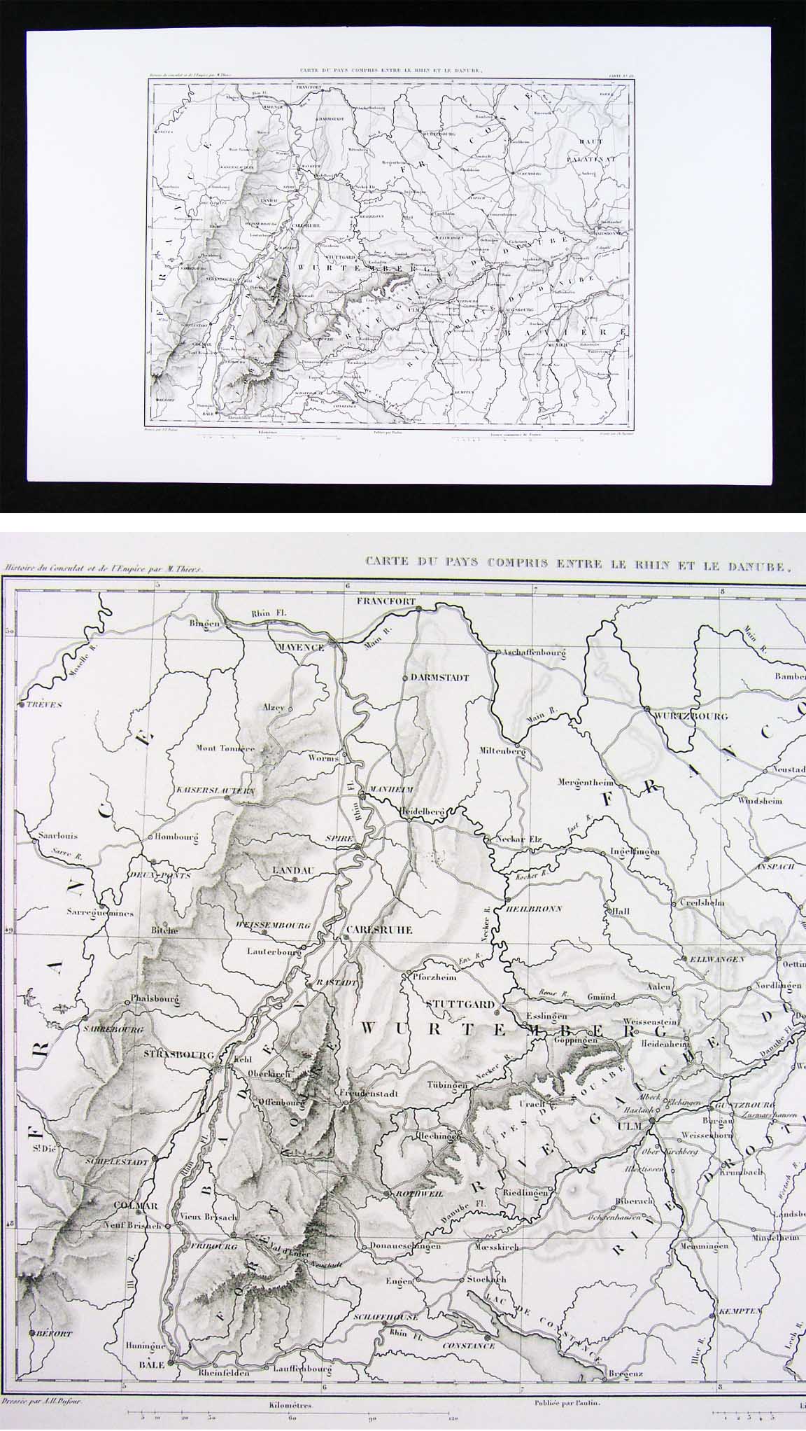 Description: It is an original engraved antique map in excellent condition with the plate mark indentions clearly shown in the margins. It is designed by A.H. Dufour and was published in M.A. Thiers' Atlas de L'Histoire du Consulat et de L'Empire (Paris: Paulin, 1859). The map itself is well documented on the map: the title of the atlas appears in the upper left margin, the title of the map in the top center, the plate number in the upper right, the designer Dufour's name in the bottom left, the publisher Paulin's name in bottom center and the engraver Dyonnet in the bottom right. A copy of the title page with the date is also included for authenticity. This series of maps were designed to illustrate the terrain of the battles of the Napoleonic campaigns. They are very detailed in terms of the topography and are generally focused on a particular region, battlefield or campaign, although military positions are generally not shown. It is not matted nor mounted, being sold as a single individual sheet as seen in the main pic. It is very early in date for this degree of detail, published without a centerfold: usually they were folded in half for some editions, so it is exceptionally nice for framing.