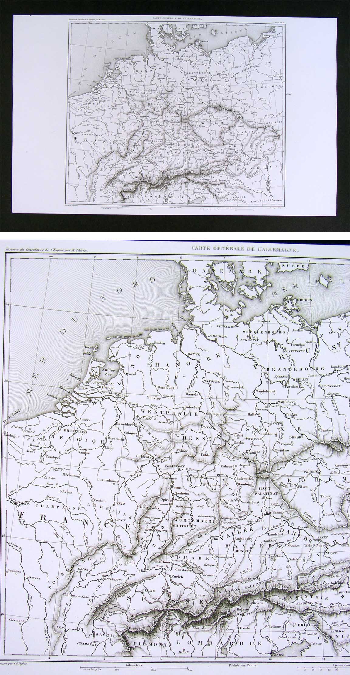 Description: It is an original engraved antique map in excellent condition with the plate mark indentions clearly shown in the margins. It is designed by A.H. Dufour and was published in M.A. Thiers' Atlas de L'Histoire du Consulat et de L'Empire (Paris: Paulin, 1859). The map itself is well documented on the map: the title of the atlas appears in the upper left margin, the title of the map in the top center, the plate number in the upper right, the designer Dufour's name in the bottom left, the publisher Paulin's name in bottom center and the engraver Dyonnet in the bottom right. A copy of the title page with the date is also included for authenticity. This series of maps were designed to illustrate the terrain of the battles of the Napoleonic campaigns. They are very detailed in terms of the topography and are generally focused on a particular region, battlefield or campaign, although military positions are generally not shown. It is not matted nor mounted, being sold as a single individual sheet as seen in the main pic. It is very early in date for this degree of detail, published without a centerfold: usually they were folded in half for some editions, so it is exceptionally nice for framing.