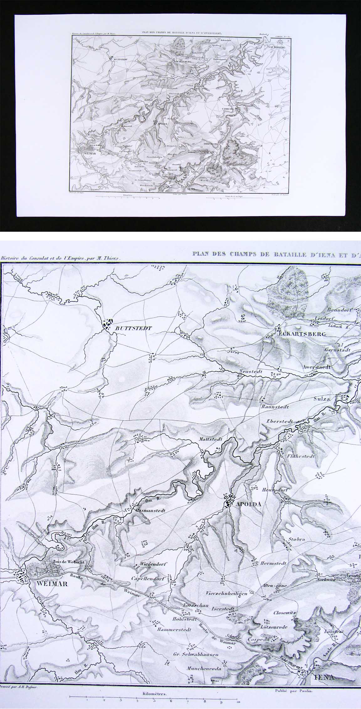 Description: It is an original engraved antique map in excellent condition with the plate mark indentions clearly shown in the margins. It is designed by A.H. Dufour and was published in M.A. Thiers' Atlas de L'Histoire du Consulat et de L'Empire (Paris: Paulin, 1859). The map itself is well documented on the map: the title of the atlas appears in the upper left margin, the title of the map in the top center, the plate number in the upper right, the designer Dufour's name in the bottom left, the publisher Paulin's name in bottom center and the engraver Dyonnet in the bottom right. A copy of the title page with the date is also included for authenticity. This series of maps were designed to illustrate the terrain of the battles of the Napoleonic campaigns. They are very detailed in terms of the topography and are generally focused on a particular region, battlefield or campaign, although military positions are generally not shown. It is not matted nor mounted, being sold as a single individual sheet as seen in the main pic. It is very early in date for this degree of detail, published without a centerfold: usually they were folded in half for some editions, so it is exceptionally nice for framing.