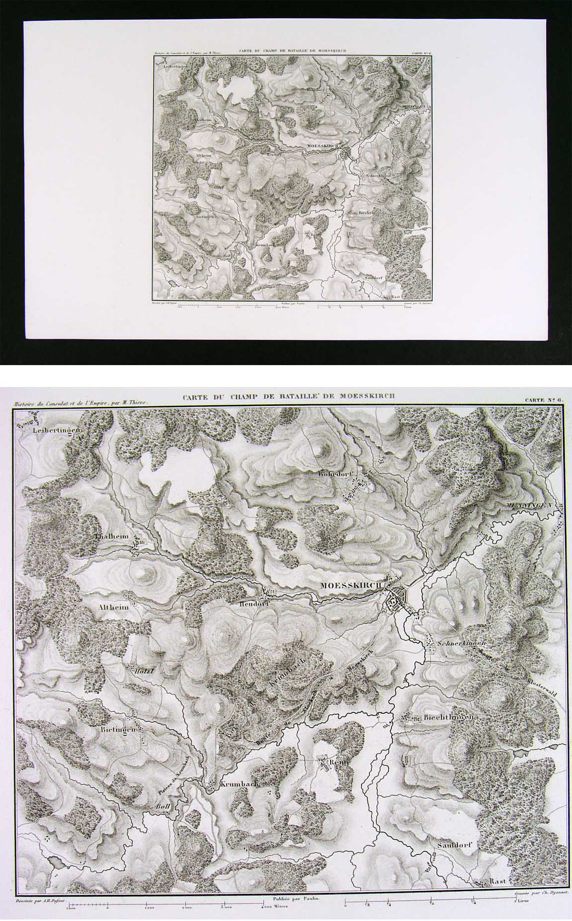 Description: It is an original engraved antique map in excellent condition with the plate mark indentions clearly shown in the margins. It is designed by A.H. Dufour and was published in M.A. Thiers' Atlas de L'Histoire du Consulat et de L'Empire (Paris: Paulin, 1859). The map itself is well documented on the map: the title of the atlas appears in the upper left margin, the title of the map in the top center, the plate number in the upper right, the designer Dufour's name in the bottom left, the publisher Paulin's name in bottom center and the engraver Dyonnet in the bottom right. A copy of the title page with the date is also included for authenticity. This series of maps were designed to illustrate the terrain of the battles of the Napoleonic campaigns. They are very detailed in terms of the topography and are generally focused on a particular region, battlefield or campaign, although military positions are generally not shown. It is not matted nor mounted, being sold as a single individual sheet as seen in the main pic. It is very early in date for this degree of detail, published without a centerfold: usually they were folded in half for some editions, so it is exceptionally nice for framing.