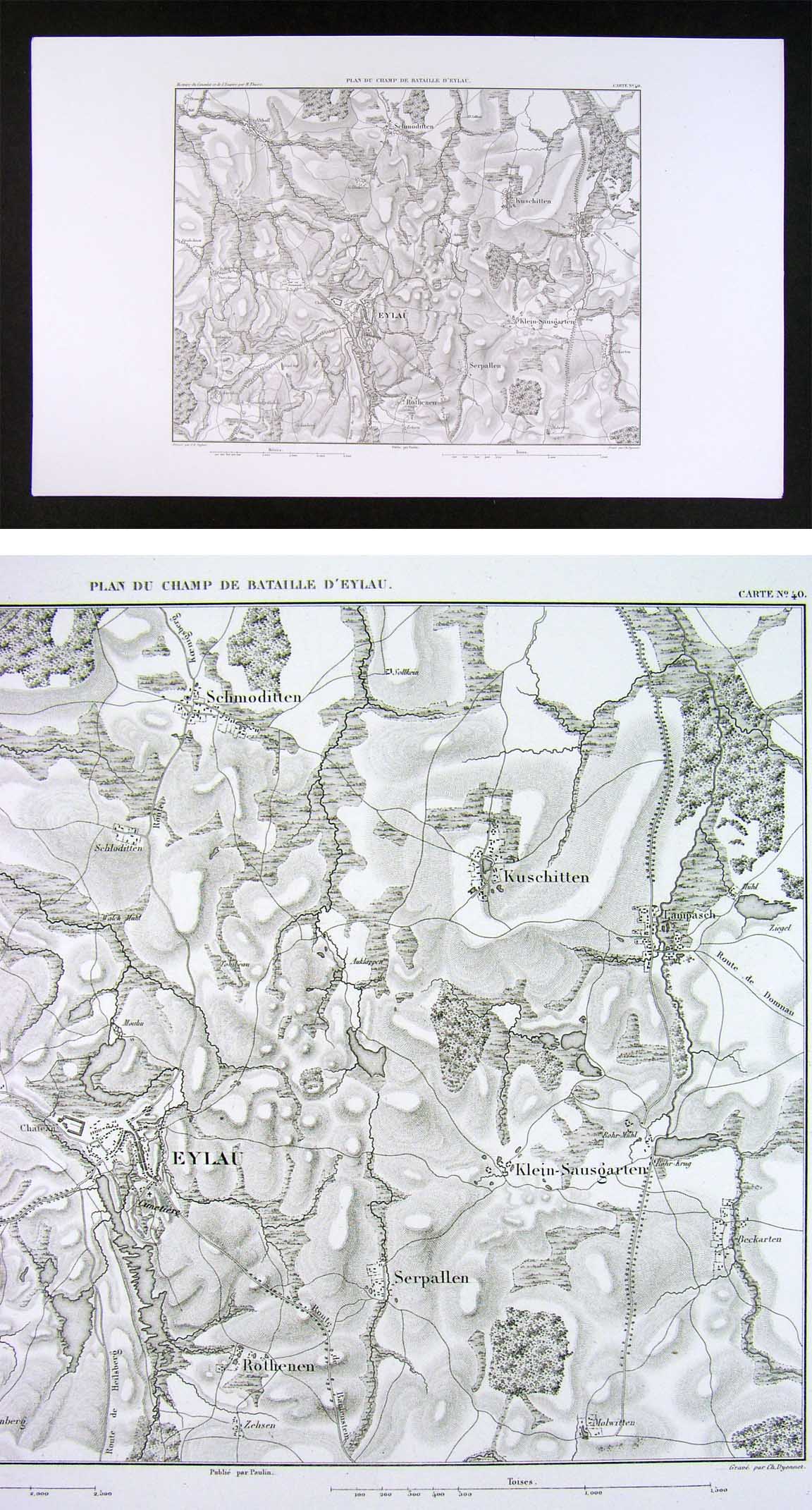 Description: It is an original engraved antique map in excellent condition with the plate mark indentions clearly shown in the margins. It is designed by A.H. Dufour and was published in M.A. Thiers' Atlas de L'Histoire du Consulat et de L'Empire (Paris: Paulin, 1859). The map itself is well documented on the map: the title of the atlas appears in the upper left margin, the title of the map in the top center, the plate number in the upper right, the designer Dufour's name in the bottom left, the publisher Paulin's name in bottom center and the engraver Dyonnet in the bottom right. A copy of the title page with the date is also included for authenticity. This series of maps were designed to illustrate the terrain of the battles of the Napoleonic campaigns. They are very detailed in terms of the topography and are generally focused on a particular region, battlefield or campaign, although military positions are generally not shown. It is not matted nor mounted, being sold as a single individual sheet as seen in the main pic. It is very early in date for this degree of detail, published without a centerfold: usually they were folded in half for some editions, so it is exceptionally nice for framing.