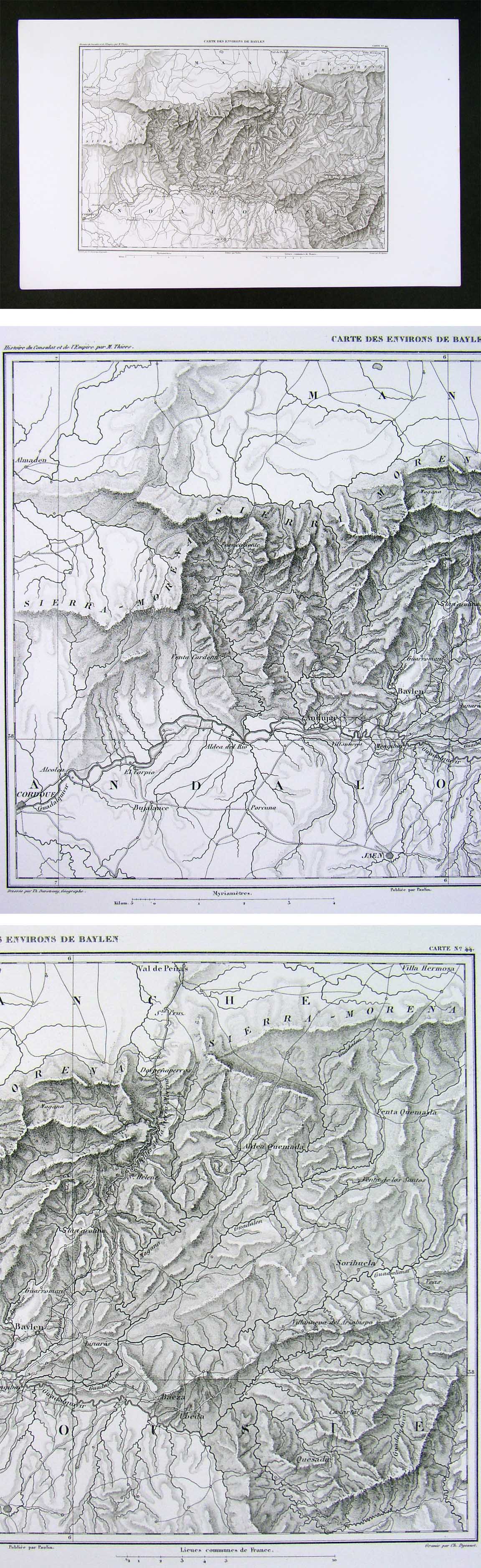 Description: It is an original engraved antique map in excellent condition with the plate mark indentions clearly shown in the margins. It is designed by A.H. Dufour and was published in M.A. Thiers' Atlas de L'Histoire du Consulat et de L'Empire (Paris: Paulin, 1859). The map itself is well documented on the map: the title of the atlas appears in the upper left margin, the title of the map in the top center, the plate number in the upper right, the the name of the designer Th. Duvotenay in the bottom left, the publisher Paulin's name in bottom center and the engraver Dyonnet in the bottom right. A copy of the title page with the date is also included for authenticity. This series of maps were designed to illustrate the terrain of the battles of the Napoleonic campaigns. They are very detailed in terms of the topography and are generally focused on a particular region, battlefield or campaign, although military positions are generally not shown. It is not matted nor mounted, being sold as a single individual sheet as seen in the main pic. It is very early in date for this degree of detail, published without a centerfold: usually they were folded in half for some editions, so it is exceptionally nice for framing.