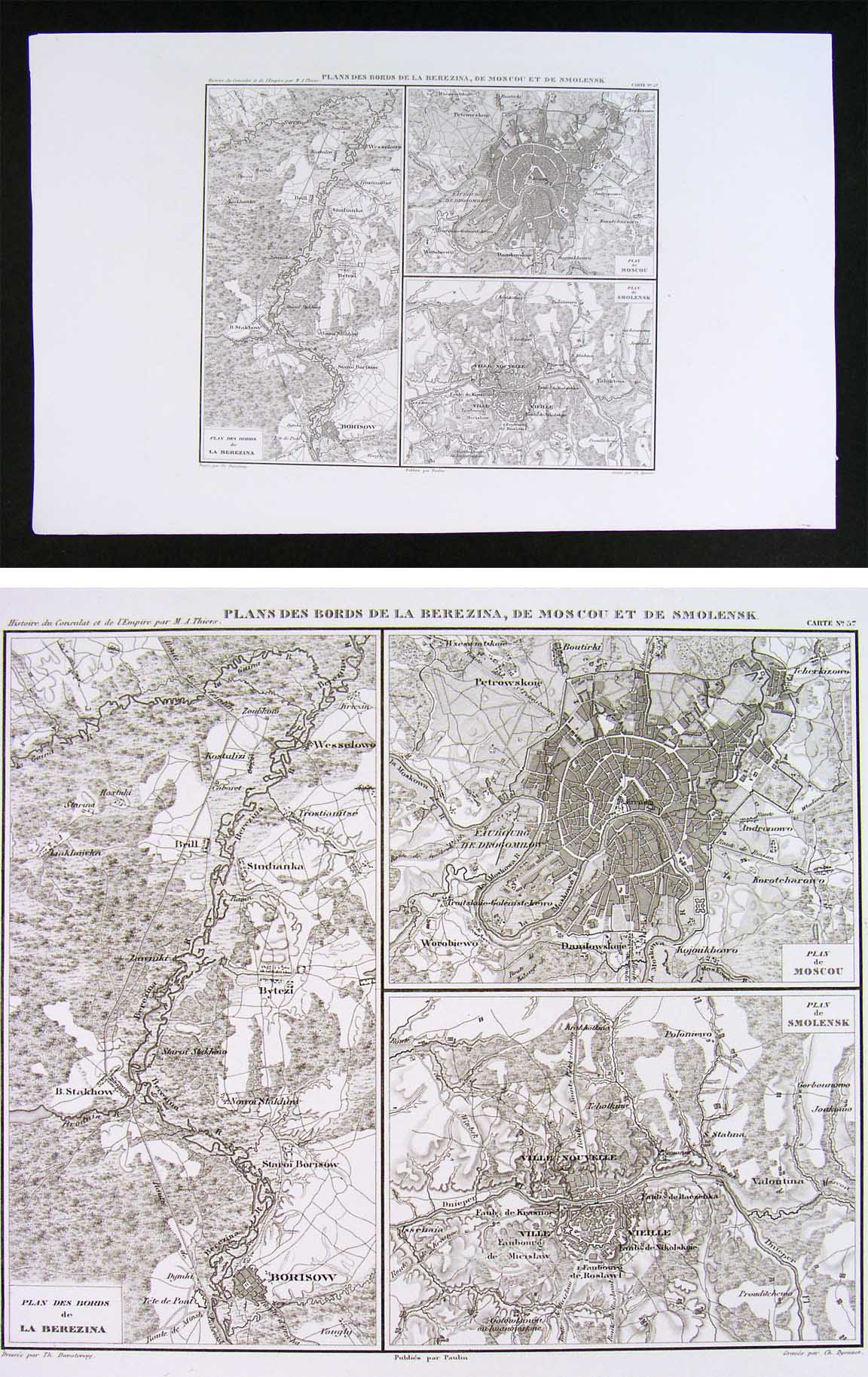 Description:  It is an original engraved antique map in excellent condition with the plate mark indentions clearly shown in the margins. It is designed by A.H. Dufour and was published in M.A. Thiers' Atlas de L'Histoire du Consulat et de L'Empire (Paris: Paulin, 1859).  The map itself is well documented on the map: the title of the atlas appears in the upper left margin, the title of the map in the top center, the plate number in the upper right, the name of the designer Th. Duvotenay in the bottom left, the publisher Paulin's name in bottom center and the engraver Dyonnet in the bottom right. A copy of the title page with the date is also included for authenticity.  This series of maps were designed to illustrate the terrain of the battles of the Napoleonic campaigns.  They are very detailed in terms of the topography and are generally focused on a particular region, battlefield or campaign, although military positions are generally not shown. It is not matted nor mounted, being sold as a single individual sheet as seen in the main pic. It is very early in date for this degree of detail, published without a centerfold: usually they were folded in half for some editions, so it is exceptionally nice for framing.
