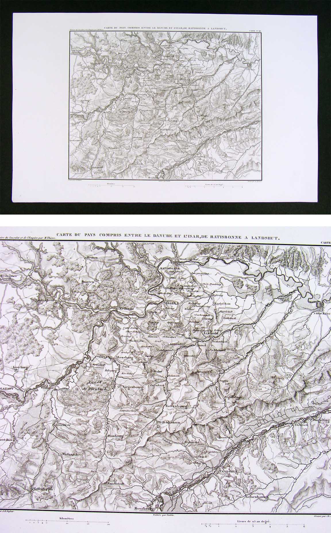 Description: It is an original engraved antique map in excellent condition with the plate mark indentions clearly shown in the margins. It is designed by A.H. Dufour and was published in M.A. Thiers' Atlas de L'Histoire du Consulat et de L'Empire (Paris: Paulin, 1859). The map itself is well documented on the map: the title of the atlas appears in the upper left margin, the title of the map in the top center, the plate number in the upper right, the designer Dufour's name in the bottom left, the publisher Paulin's name in bottom center and the engraver Dyonnet in the bottom right. A copy of the title page with the date is also included for authenticity. This series of maps were designed to illustrate the terrain of the battles of the Napoleonic campaigns. They are very detailed in terms of the topography and are generally focused on a particular region, battlefield or campaign, although military positions are generally not shown. It is not matted nor mounted, being sold as a single individual sheet as seen in the main pic. It is very early in date for this degree of detail, published without a centerfold: usually they were folded in half for some editions, so it is exceptionally nice for framing.