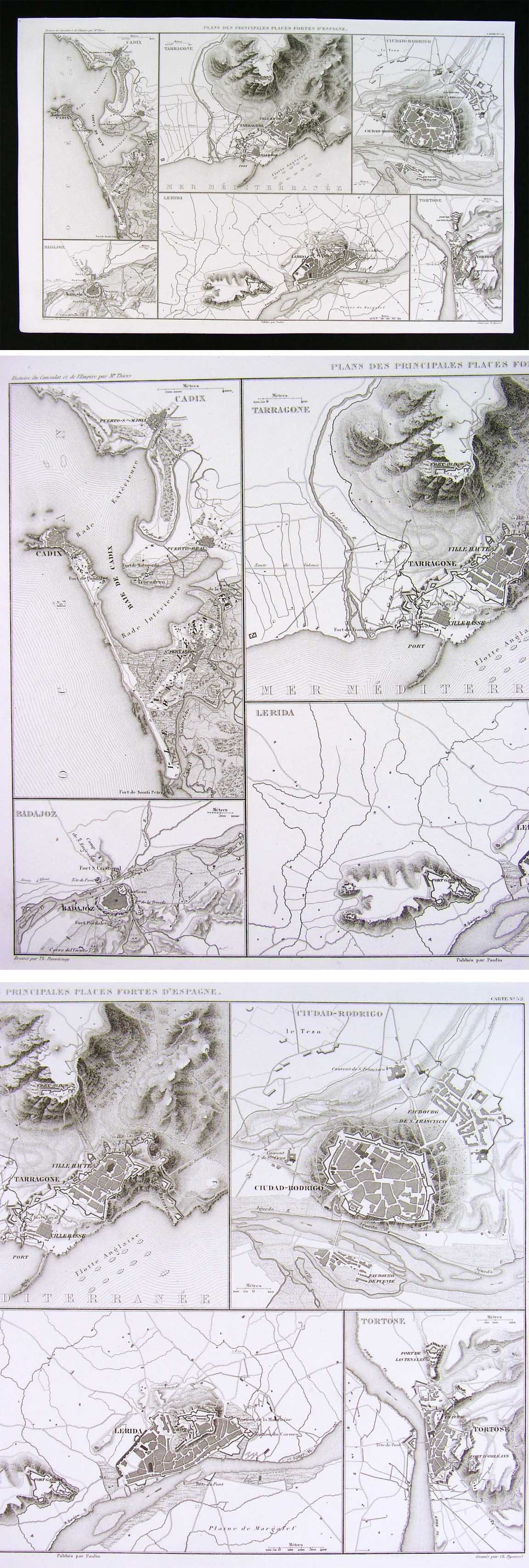 Description: It is an original engraved antique map in excellent condition with the plate mark indentions clearly shown in the margins. It is designed by A.H. Dufour and was published in M.A. Thiers' Atlas de L'Histoire du Consulat et de L'Empire (Paris: Paulin, 1859). The map itself is well documented on the map: the title of the atlas appears in the upper left margin, the title of the map in the top center, the plate number in the upper right, the name of the designer Th. Duvotenay in the bottom left, the publisher Paulin's name in bottom center and the engraver Dyonnet in the bottom right. A copy of the title page with the date is also included for authenticity. This series of maps were designed to illustrate the terrain of the battles of the Napoleonic campaigns. They are very detailed in terms of the topography and are generally focused on a particular region, battlefield or campaign, although military positions are generally not shown. It is not matted nor mounted, being sold as a single individual sheet as seen in the main pic. It is very early in date for this degree of detail, published without a centerfold: usually they were folded in half for some editions, so it is exceptionally nice for framing. A very nice selection of Spanish locations involved in the Napoleonic Campaign through Spain including Ciudad Rodrigo, Badajoz, Lerida, Cadiz, Tarragone and Tortose.
