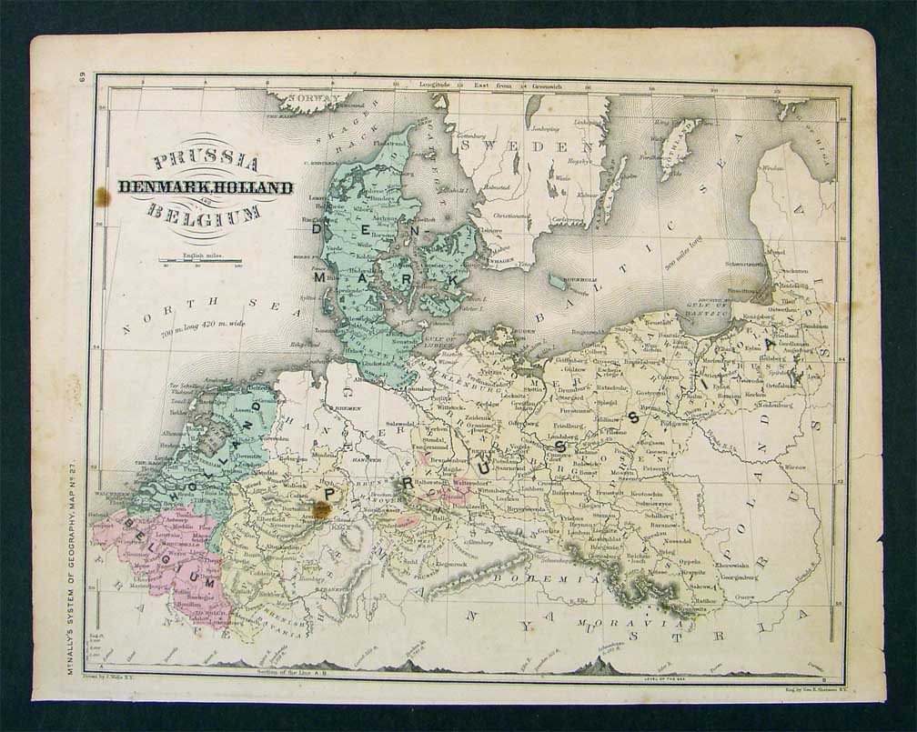 Description: It is an authentic Antique map over 150 years old with original handcoloring as issued. It is from Francis McNally's System of Geography: National Geographical Series, No. 3 (New York: S. Barnes & Co., 1857). It is designed by J. Wells, NY as stated in the bottom margin and the title of the atlas is along the top. A copy of the title page is included for authenticity. The map is not mounted nor matted, being sold as a single sheet as seen in the first pic.