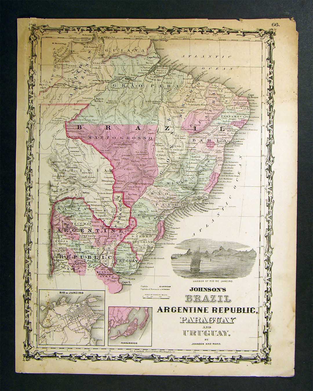 Description: It is an authentic engraved antique Civil War era map with original handcoloring and the desirable decorative border and blank on the reverse. It is from the 1860 First Edition of Johnson's Family Atlas. A copy of the title page is included for authenticity. It is not matted nor framed being sold as a single sheet as shown in the main pic. The map shows the separate Diamond Region inside of Bahia and a plan of Rio and Recife, labeled as Pernambuco.