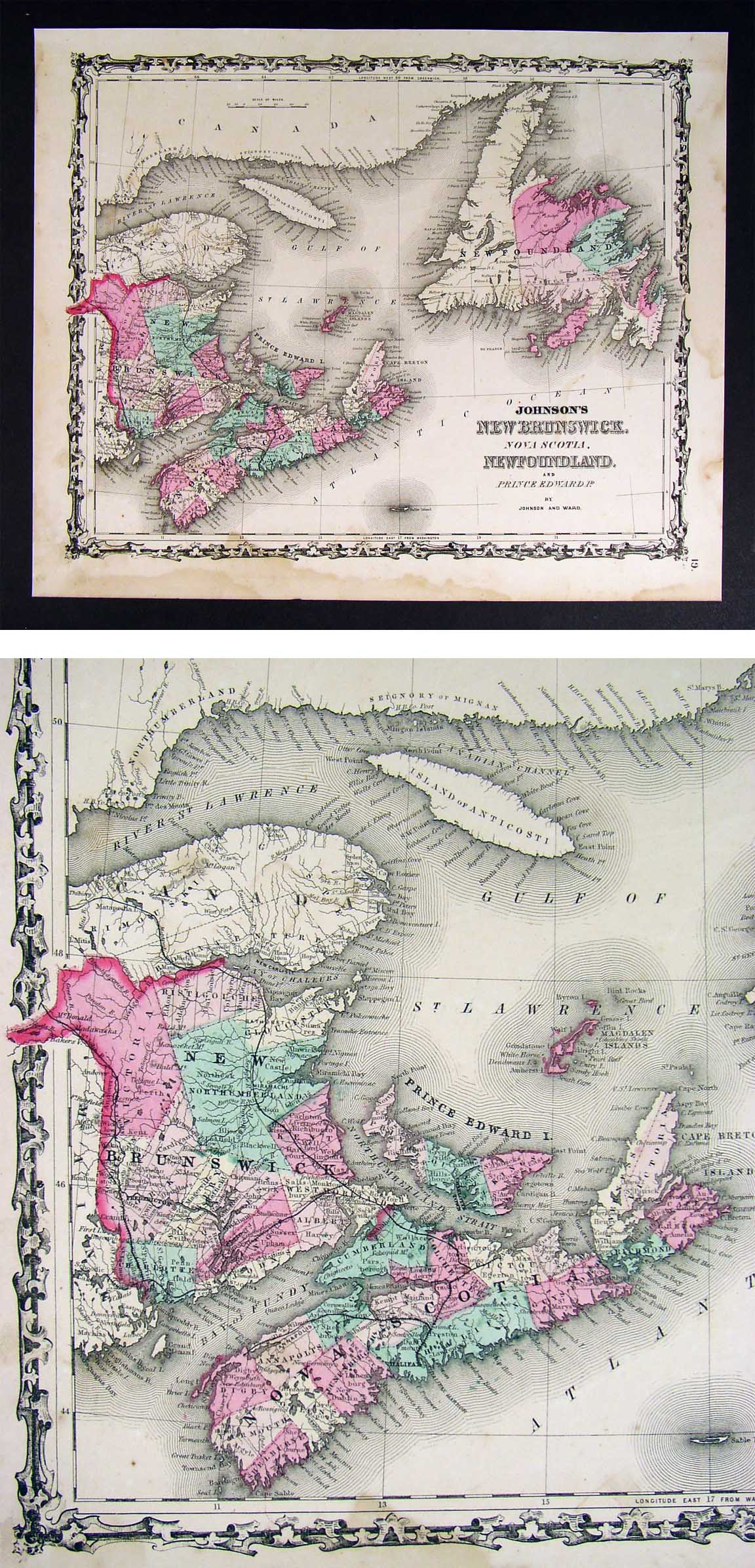 Description: It is an authentic engraved antique Civil War era map approximately 145 years old with original handcoloring and the desirable decorative border. It is from the 1860 First Edition of Johnson's Family Atlas. A copy of the title page is included for authenticity. It is not matted nor framed being sold as a single sheet as shown in the main pic.