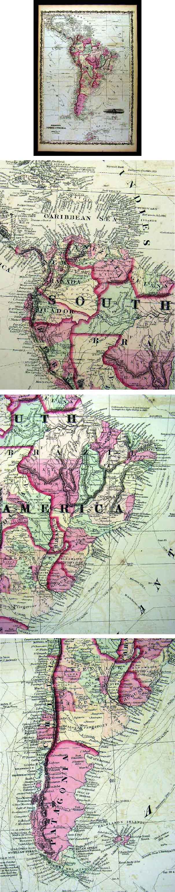 Description: It is an original engraved antique map in great shape with hand coloring and decorative border with a centerfold as issued. It is from a 1862 Edition of Johnson's Family Atlas. A copy of the title page is included for authenticity, which has all the publishing and award details. An interesting map showing Patagonia as a separate entity, Bolivia with a seaport and border almost to the Amazon, Columbia as New Granada and other border anomalies. Also shown are exploration routes: Columbus, Cook, Vancouver, Colnet, Carteret, Wallis, Byron, Anson, etc. Being sold as a single sheet, not mounted, matted nor framed. Overall, a Beautiful Map that will frame up nicely.