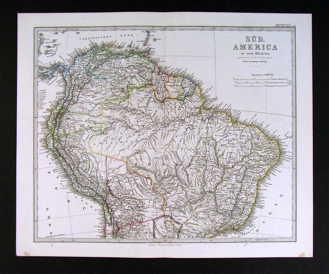 Description: It is an original antique map approximately 135 years old with original hand coloring and a centerfold as issued with the plate marks embossed around the edges. It is from the 1870 edition of Stieler's Hand Atlas, published in Gotha by Justus Perthes. The publisher and date are shown on the map in the bottom margin and the name of the atlas is in the upper right corner. The map is not mounted nor matted, being sold as a single sheet as seen in the first pic. The Stieler maps are some of the most detailed of the 19th century in the German tradition of cartography.