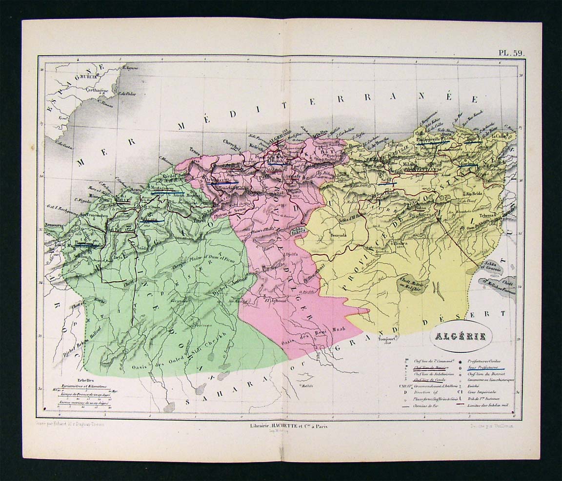 Description: It is an authentic Antique map with original handcoloring as issued. It is from M.N. Bouillet's Atlas Universel d'Histoire et de Geographie, published in Paris by the Librairie Hachetter, 1872. A copy of the Atlas title page is included for authenticity. The engraving company 'Grave Chez Erhard, 12 R. Duguay Trouin" is printed in the bottom left margin and the name of the map designer, Vuillemin, appears in the bottom right, with the Hachette Company address in the bottom center. It is blank on the reverse with a centerfold as issued. It is being sold as a single sheet, not matted nor framed, as shown in the pic.