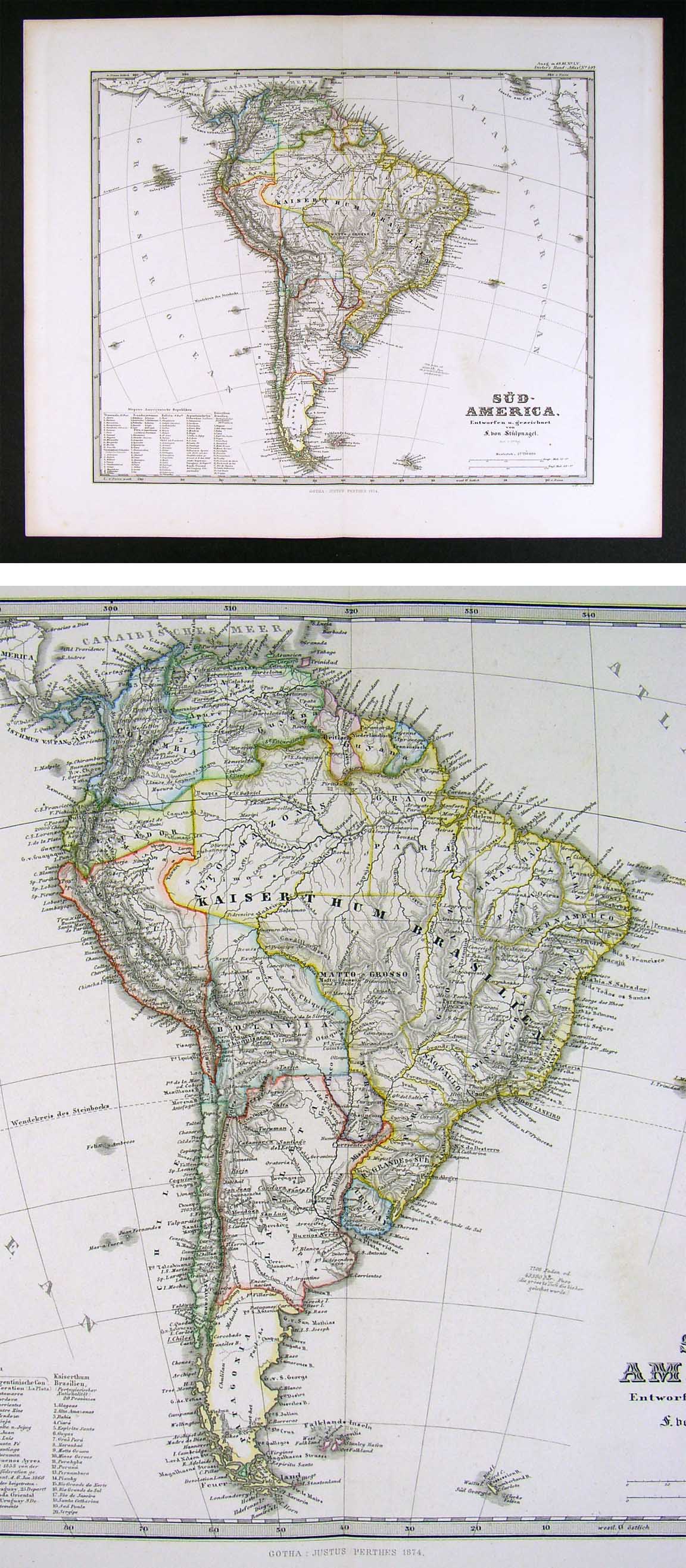 Description: It is an original antique map approximately 135 years old with original hand coloring and a centerfold as issued with the plate marks embossed around the edges. It is from the 1874 edition of Stieler's Hand Atlas, designed and engraved by F.V. Stulpnagel and published in Gotha by Justus Perthes. The publisher and date are shown on the map in the bottom margin and the name of the atlas is in the upper right corner with Stulpnagel's name in the title block. The map is not mounted nor matted, being sold as a single sheet as seen in the first pic. The Stieler maps are some of the most detailed of the 19th century in the German tradition of cartography.