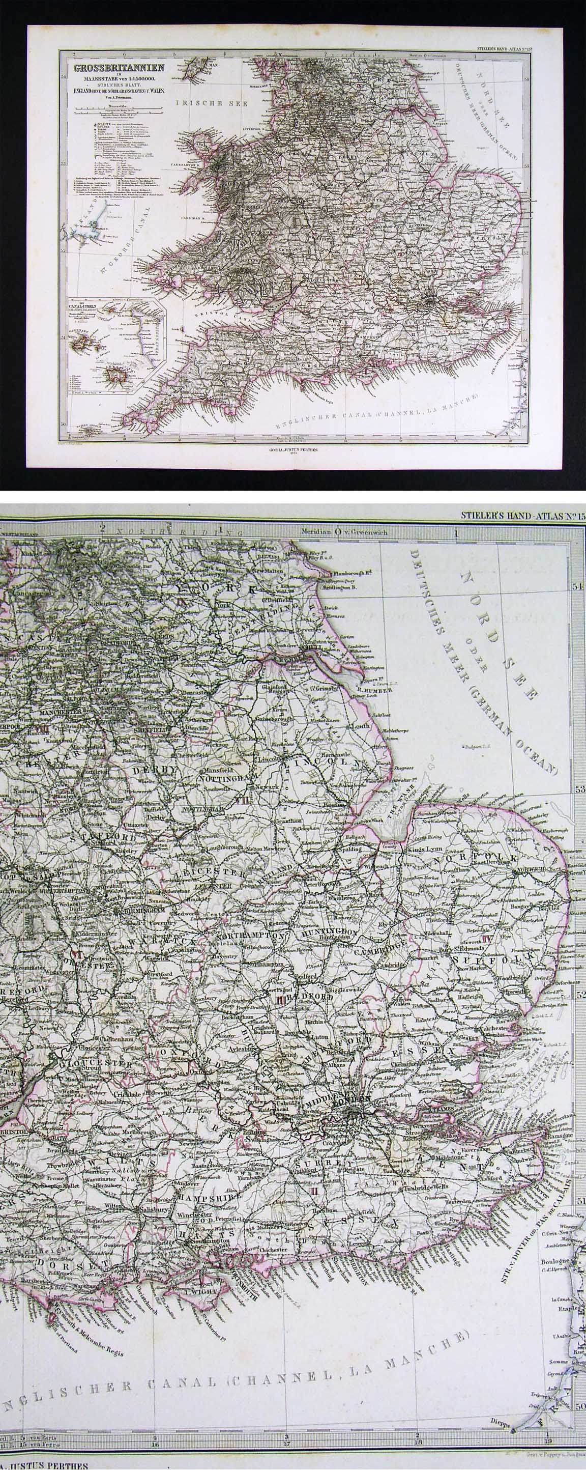 Description: It is an original antique map approximately 130 years old with original hand coloring and a centerfold as issued. It is from the 1876 edition of Stieler's Hand Atlas, published in Gotha by Justus Perthes. The publisher and date are shown on the map in the bottom margin and the name of the atlas is in the upper right corner. The map is not mounted nor matted, being sold as a single sheet as seen in the first pic. The Stieler maps are some of the most detailed of the 19th century in the German tradition of cartography.