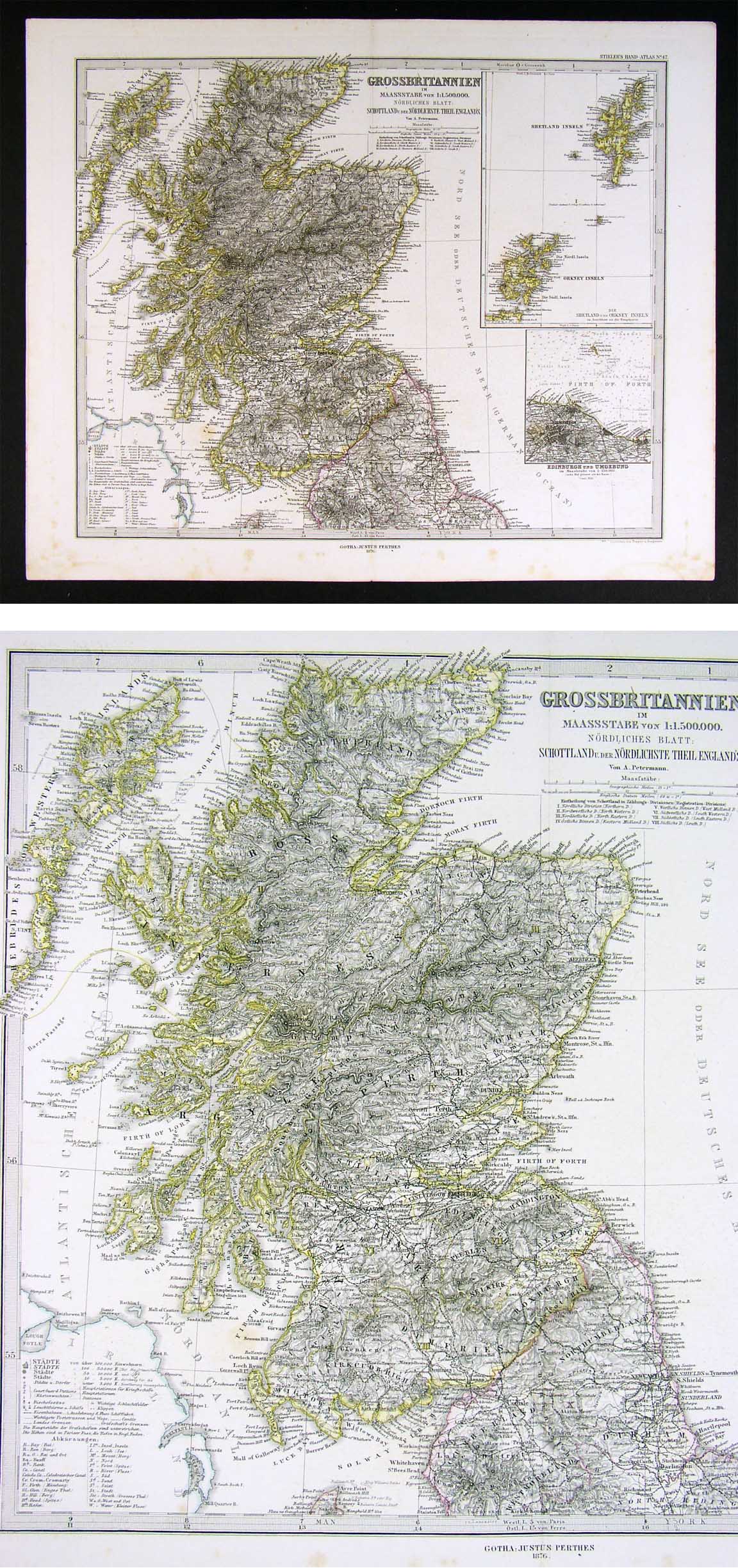 Description: It is an original antique map approximately 135 years old with original hand coloring and a centerfold as issued with the plate marks embossed around the edges. It is designed by A. Petermann, stated in the title block and is from the 1876 edition of Stieler's Hand Atlas, published in Gotha by Justus Perthes. The publisher and date are shown on the map in the bottom margin and the name of the atlas is in the upper right corner. The map is not mounted nor matted, being sold as a single sheet as seen in the first pic. The Stieler maps are some of the most detailed of the 19th century in the German tradition of cartography. There are nice insets of the Shetland and Orkney Islands and of the Environment of Edinburgh.