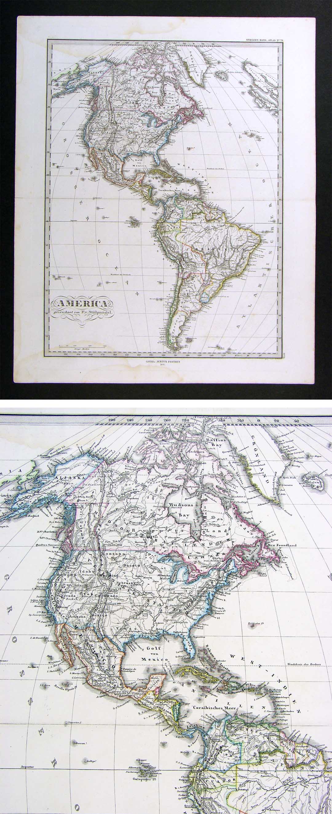 Description: It is an original antique map approximately 135 years old with original hand coloring and a centerfold as issued. It is from the 1876 edition of Stieler's Hand Atlas, designed and engraved by F.V. Stulpnagel and published in Gotha by Justus Perthes. The publisher and date are shown on the map in the bottom margin and the name of the atlas is in the upper right corner with Stulpnagel's name in the title block. The map is not mounted nor matted, being sold as a single sheet as seen in the first pic. The Stieler maps are some of the most detailed of the 19th century in the German tradition of cartography.