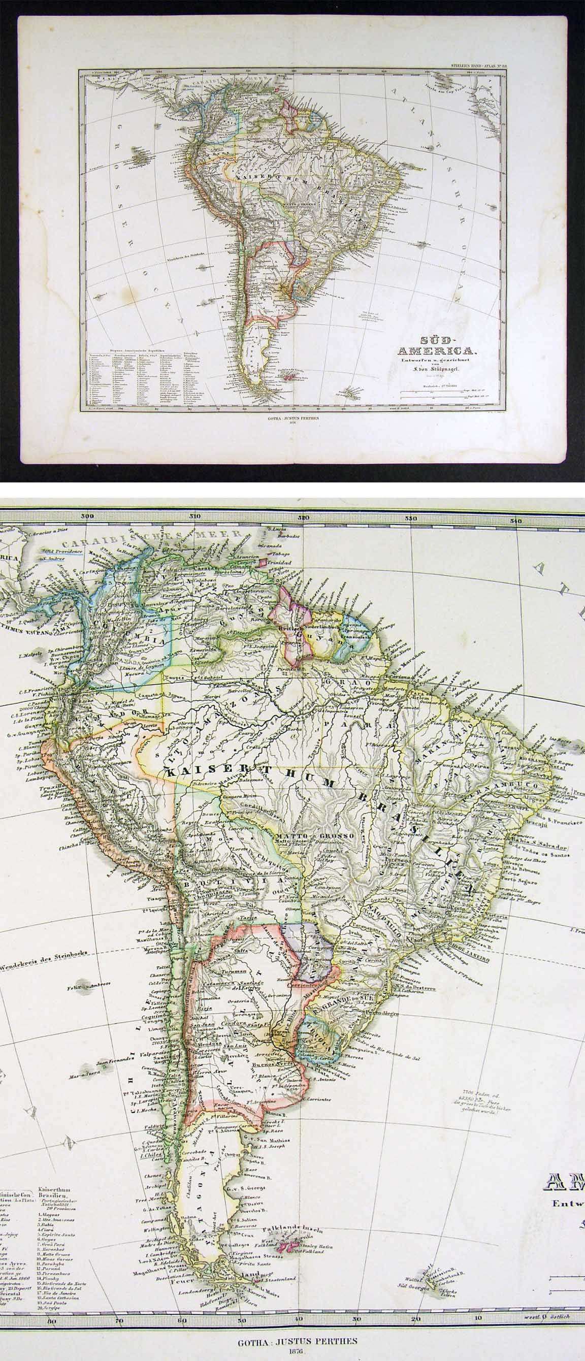 Description: It is an original antique map approximately 135 years old with original hand coloring and a centerfold as issued with the plate marks embossed around the edges. It is from the 1876 edition of Stieler's Hand Atlas, published in Gotha by Justus Perthes. The publisher and date are shown on the map in the bottom margin and the name of the atlas is in the upper right corner. The map is not mounted nor matted, being sold as a single sheet as seen in the first pic. The Stieler maps are some of the most detailed of the 19th century in the German tradition of cartography.