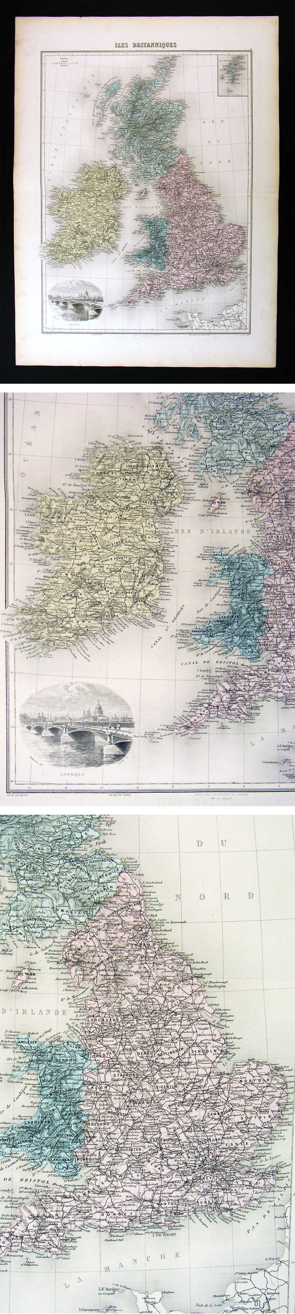 Description: It is an original engraved antique map in great shape with original handcoloring and a nice vignette or view of Lisbon and Madrid. It is from Migeon's Nouvel Atlas Illustre Geographie Universelle, c. 1880s. A copy of the title page of the Atlas is included. The atlas was prepared under the direction of J. Migeon by Charles Lacoste, whose names appear in the bottom margin. There is a double sided text page included with the map.