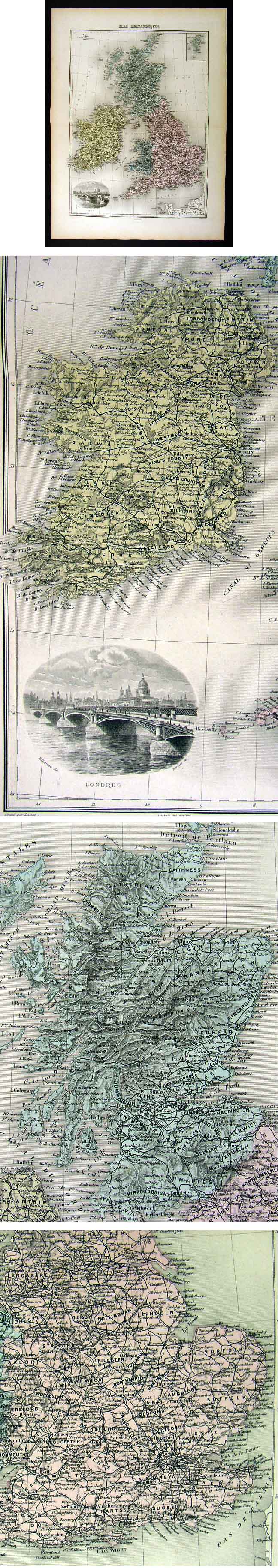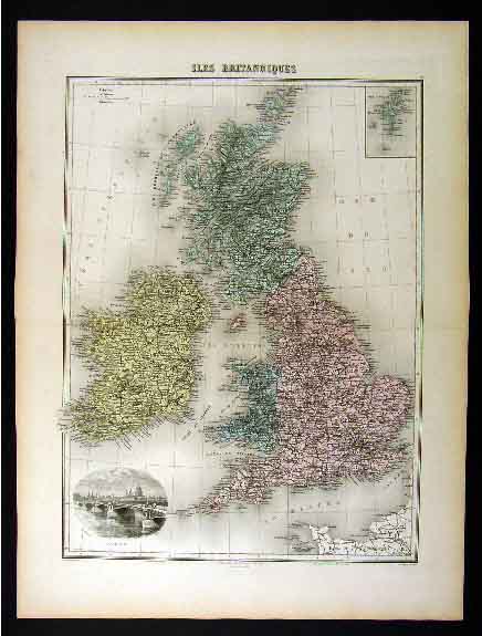 Description: It is an original engraved antique map with original hand coloring and centerfold as issued. It is from Migeon's Nouvel Atlas Illustre Geographie Universelle, published in Paris: Migeon editor, c. 1880. A copy of the title page is included for authenticity. The publication details are in the bottom margin. The map is not mounted nor matted, being sold as a single sheet as seen in the first pic. A beautiful map with a nice vignette of London in the corner. Also included is one related double sided page of text.