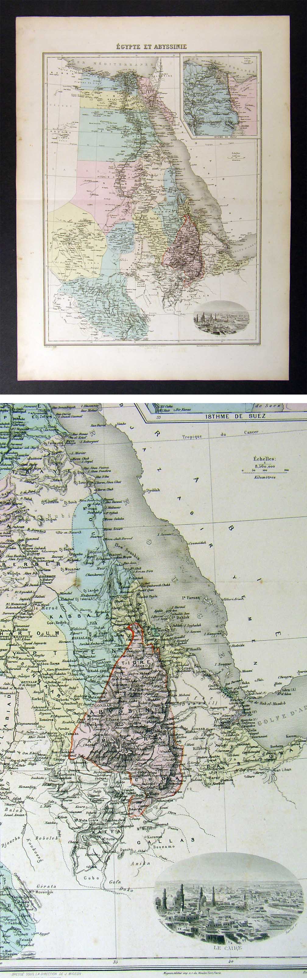 Description: It is an original engraved antique map over 120 years old with original hand coloring and centerfold as issued. It is from Migeon's Nouvel Atlas Illustre Geographie Universelle, published in Paris: Migeon editor, c. 1880. A copy of the title page is included for authenticity. The publication details are in the bottom margin. The map is not mounted nor matted, being sold as a single sheet as seen in the first pic. A beautiful map with a nice vignette in the corner. Also included is one related double sided page of text. There is a nice vignette of Cairo and an inset of the Suez Canal.