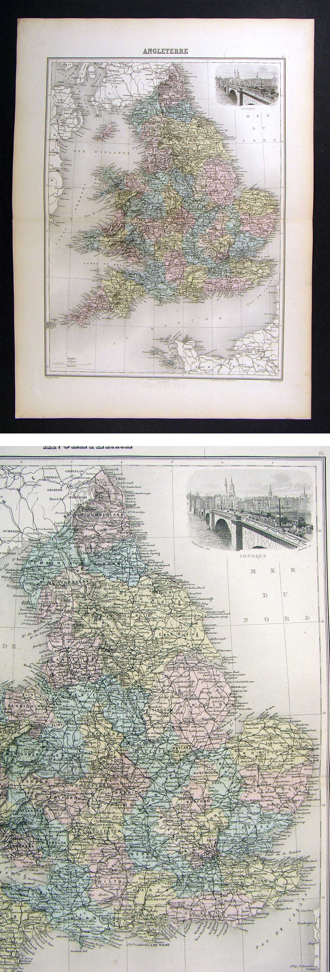 Description:  It is an original engraved antique map in great shape with original handcoloring and a nice vignette or view of Lisbon and Madrid.  It is from Migeon's Nouvel Atlas Illustre Geographie Universelle, c. 1880s.  A copy of the title page of the Atlas is included. The atlas was prepared under the direction of J. Migeon by Charles Lacoste, whose names appear in the bottom margin. There is a double sided text page included with the map.