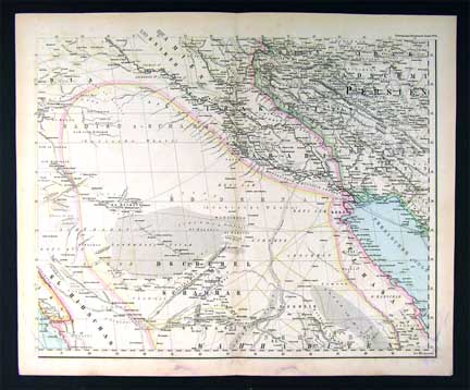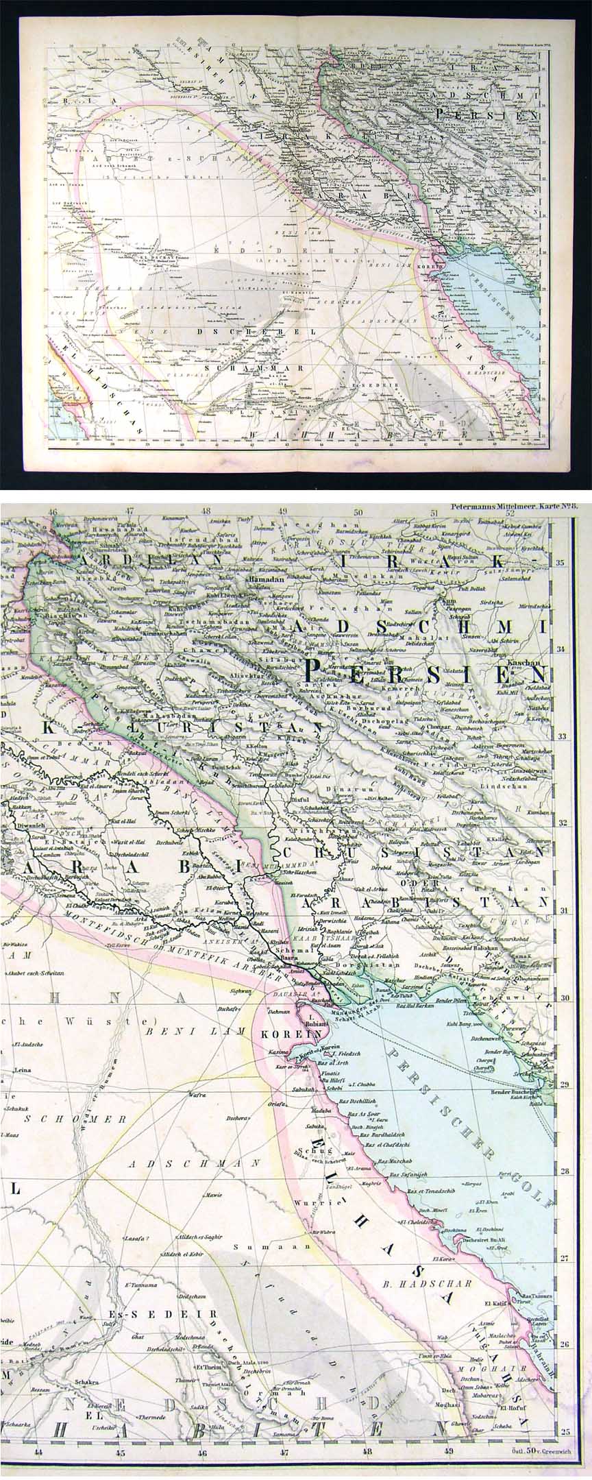 Description: It is an original antique map approximately 130 years old with original hand coloring and a centerfold as issued. It was part of a special adendum of eight maps by Petermann of the region surrounding the Mediterranean that were published in a limited number of Stieler's Hand Atlas, published in Gotha by Justus Perthes, 1880. Petermann's name appears in the bottom left. Each of the eight maps are being sold separately and are not mounted nor matted, being sold as a single sheet as seen in the first pic. The Stieler maps are some of the most detailed of the 19th century in the German tradition of cartography.