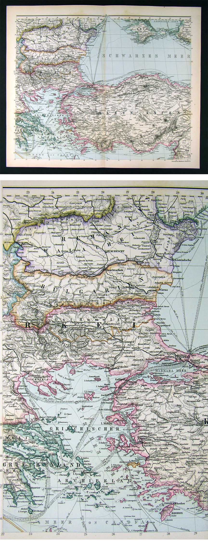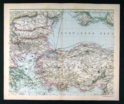 Description: It is an original antique map approximately 130 years old with original hand coloring and a centerfold as issued. It was part of a special adendum of eight maps by Petermann of the region surrounding the Mediterranean that were published in a limited number of Stieler's Hand Atlas, published in Gotha by Justus Perthes, 1880. Petermann's name appears in the bottom left. Each of the eight maps are being sold separately and are not mounted nor matted, being sold as a single sheet as seen in the first pic. The Stieler maps are some of the most detailed of the 19th century in the German tradition of cartography.