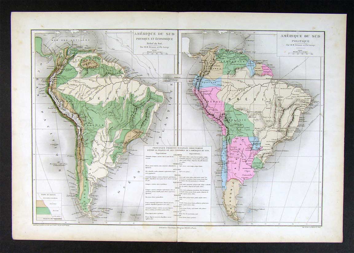 Description: It is an authentic engraved antique map approximately 130 years old with original handcoloring and a centerfold as issued. It is from the Atlas Universel et Classigue de Geographie by MM. Drioux and Ch. Leroy, published in Paris in 1882, a facsimile copy of the title page is included for authenticity.
