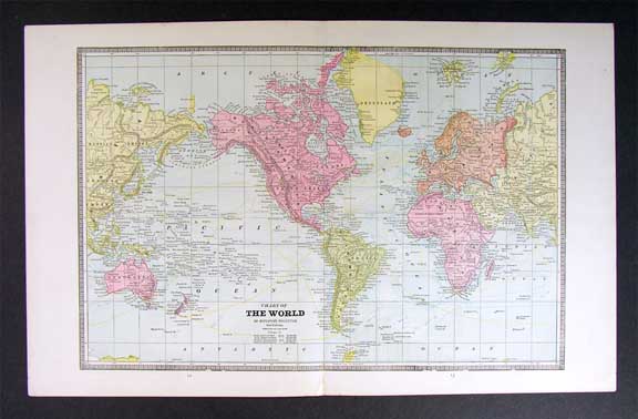 Description:  It is an authentic engraved antique map over 125 years old from an early1883 edition of Cram's Unrivaled Family Atlas of the World (Chicago, 1883). A copy of the Atlas title page is included for authenticity. It is being sold as a large double sheet with a centerfold, not mounted, matted nor framed, basically as seen in the pic, photographed against a dark background so you can see all the edges and actual condition. It has ceragraphic color, a wax engraving technique invented by Morris. There is a single page map of the Eastern Hemisphere and a diagram of state debts on the reverse side.