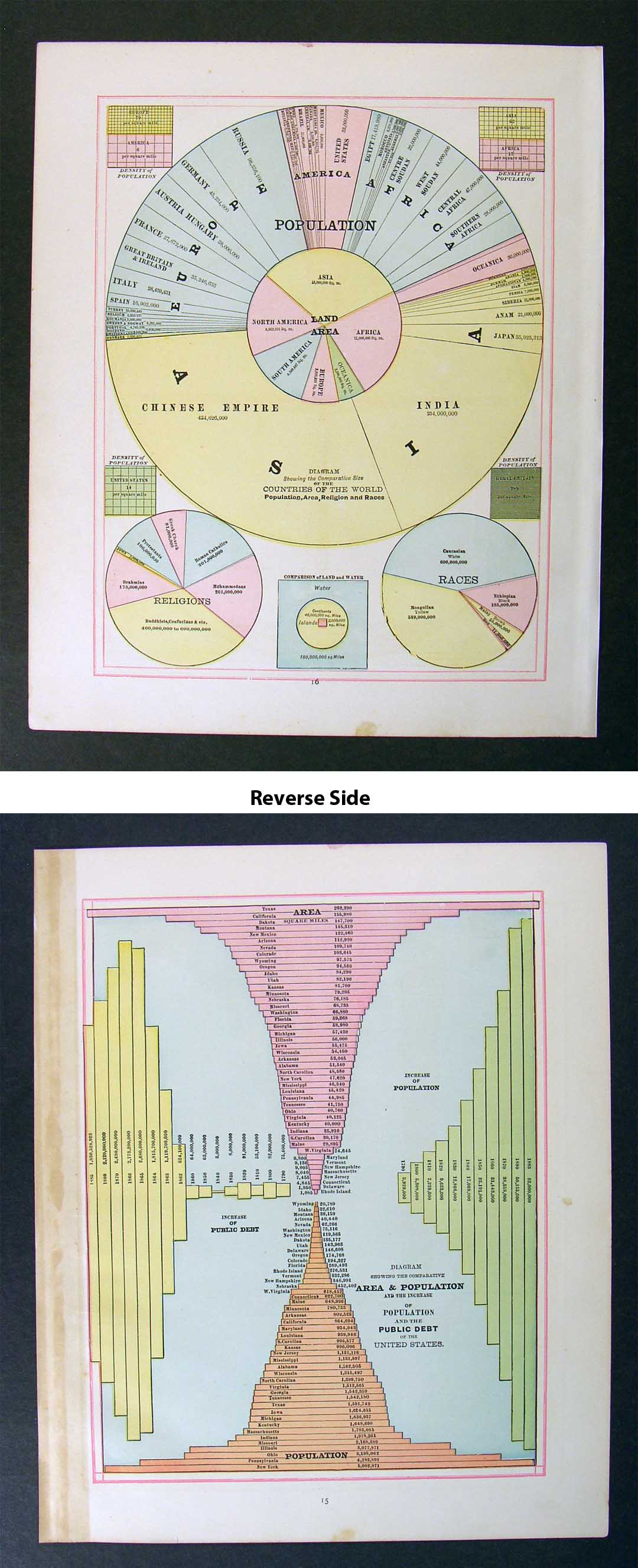 Description: It is an authentic engraved antique map over 125 years old from an early1883 edition of Cram's Unrivaled Family Atlas of the World (Chicago, 1883). A copy of the Atlas title page is included for authenticity. It is being sold as a single sheet, not mounted, matted nor framed, basically as seen in the pic, photographed against a dark background so you can see all the edges and actual condition. It has ceragraphic color, a wax engraving technique invented by Morris. There images are back to back on one sheet, so you would have to choose a side if framing.