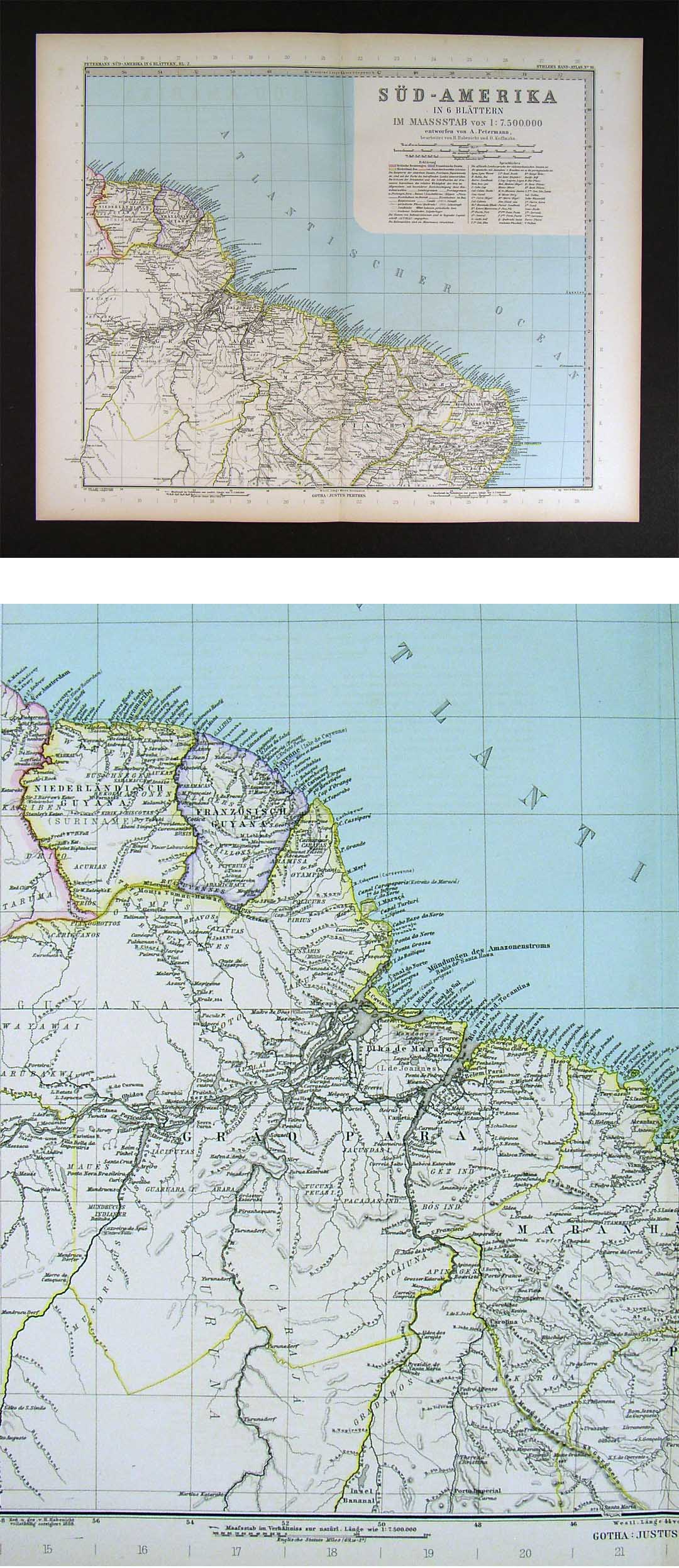 Description: It is an original antique map approximately 130 years old with original hand coloring and a centerfold as issued. It is from the 1890 edition of Stieler's Hand Atlas, published in Gotha by Justus Perthes. The map is by the great German cartographer Augustus Petermann (1822-1878), best know for Petermann’s geographische Mitteilungen, the leading geographical journal of the day supplying the world with maps and information on newly explored regions around the world including the Arctic and Africa. His maps were certainly among the most accurate and detailed of the period and led the way to a new school of cartography often referred to as the "Gotha School." His maps continued to be used and revised for years after his death in 1878 and his Mitteilungen continued until 2004. After 1865, Petermann was given the responsibility of the cartography for the Stieler Atlas and in coordination with other cartographers in the firm, he guided the production of the atlas until his death overseeing the designs and revisions based on recent discoveries. The publisher and date are shown on the map in the bottom margin and the name of the atlas is in the upper right corner and Petermann's name in the upper left corner. The map is not mounted nor matted, being sold as a single sheet with a centerfold as seen in the first pic.
