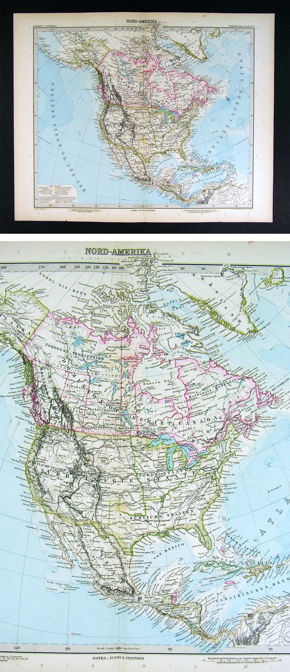 Description: It is an original antique map approximately 130 years old with original hand coloring and a centerfold as issued. It is from the 1890 edition of Stieler's Hand Atlas, published in Gotha by Justus Perthes. The map is by the great German cartographer Augustus Petermann (1822-1878), best know for Petermann’s geographische Mitteilungen, the leading geographical journal of the day supplying the world with maps and information on newly explored regions around the world including the Arctic and Africa. His maps were certainly among the most accurate and detailed of the period and led the way to a new school of cartography often referred to as the "Gotha School." His maps continued to be used and revised for years after his death in 1878 and his Mitteilungen continued until 2004. After 1865, Petermann was given the responsibility of the cartography for the Stieler Atlas and in coordination with other cartographers in the firm, he guided the production of the atlas until his death overseeing the designs and revisions based on recent discoveries. The publisher and date are shown on the map in the bottom margin and the name of the atlas is in the upper right corner and Petermann's name in the upper left corner. The map is not mounted nor matted, being sold as a single sheet with a centerfold as seen in the first pic.