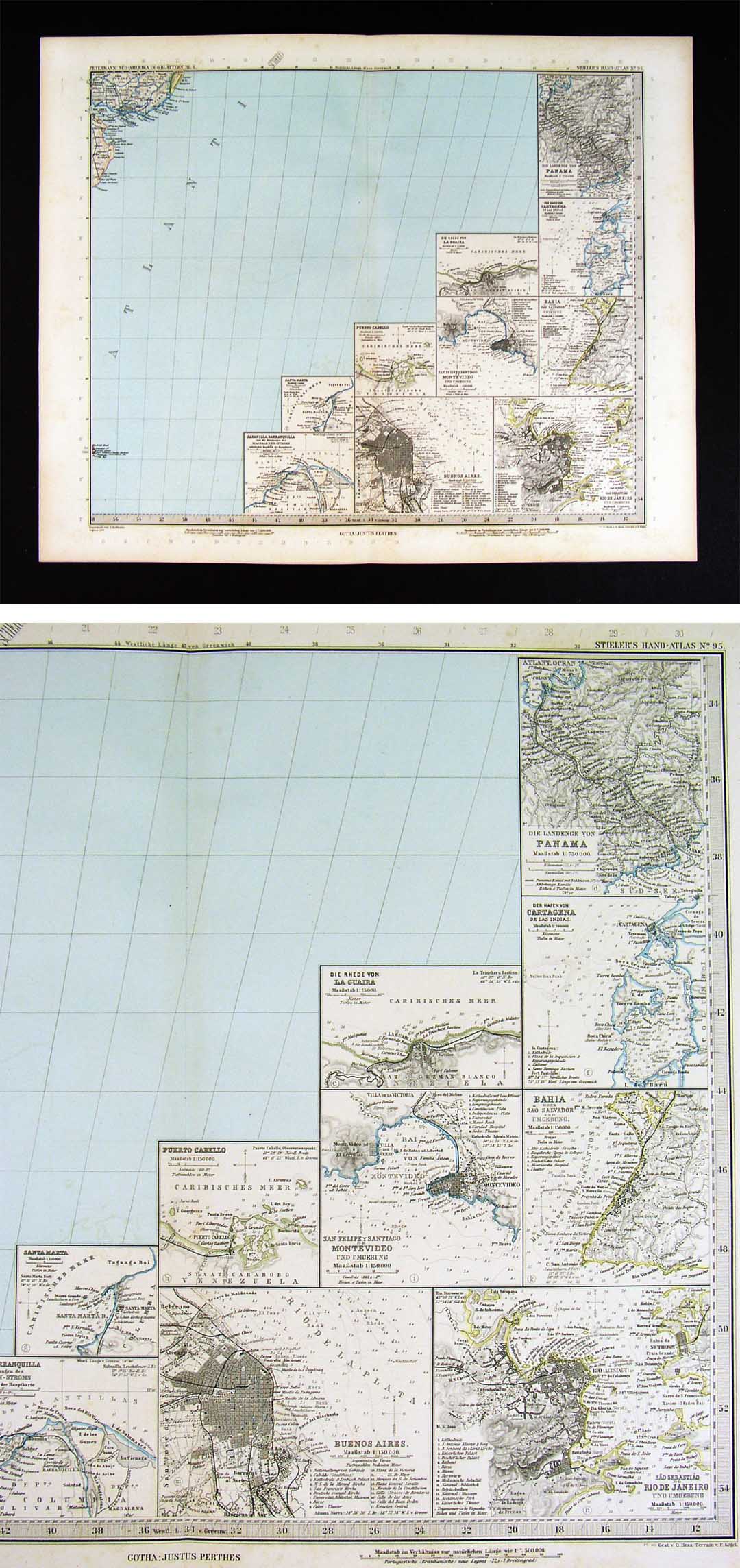 Description: It is an original antique map approximately 130 years old with original hand coloring and a centerfold as issued. It is from the 1890 edition of Stieler's Hand Atlas, published in Gotha by Justus Perthes. The map is by the great German cartographer Augustus Petermann (1822-1878), best know for Petermann’s geographische Mitteilungen, the leading geographical journal of the day supplying the world with maps and information on newly explored regions around the world including the Arctic and Africa. His maps were certainly among the most accurate and detailed of the period and led the way to a new school of cartography often referred to as the "Gotha School." His maps continued to be used and revised for years after his death in 1878 and his Mitteilungen continued until 2004. After 1865, Petermann was given the responsibility of the cartography for the Stieler Atlas and in coordination with other cartographers in the firm, he guided the production of the atlas until his death overseeing the designs and revisions based on recent discoveries. The publisher and date are shown on the map in the bottom margin and the name of the atlas is in the upper right corner and Petermann's name in the upper left corner. The map is not mounted nor matted, being sold as a single sheet with a centerfold as seen in the first pic.
