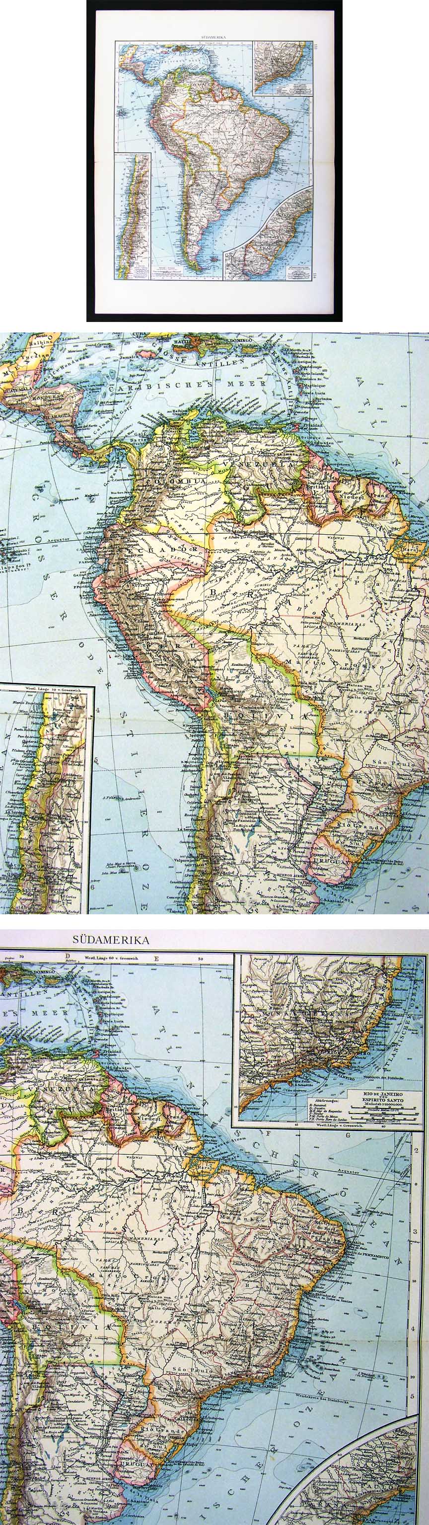 Description: It is an authentic antique map approximately 114 years old from the 1896 edition of Andrees Allgemeiner Handaltas (Andrees General Atlas), published (Beilefeld and Liepzig: Verlag von Velhagen & Klassing, 1896). A copy of the title page is included for authenticity. It was printed by Chromolithography utilizing zinc plates eteched in relief. The labeling language is in German. In general, the Andrees maps are exceptional for their detail and vibrant color, which are among the best of the late 19th century maps. The map is being sold unmatted or framed as seen in the first pic, printed on a large heavy sheet, blank on the reverse with a centerfold as issued. Overall a beautiful map in great condition. There are nice insets of the area around Rio de Janeiro, the south coast of Brazil and Uruguay; and a long inset of chile