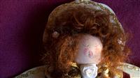 This listing is for a homemade angel that has its own built in stand. It measures 12 " tall and measures 12 " across wing span. It is made from light colored wood and is painted off white except flesh color for body parts. It has a wooden head attached with facial features and has curly reddish brown hair attached. Other trimming consists of white/gold lace, gold and mauve ribbon, gold braid and off white ribbon roses..