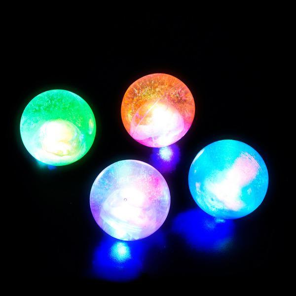 "These remarkable hi-bounce balls measure 2.2 inches in diameter and are filled with a reservoir of radiant glitter. When you bounce them, a smaller ball on the inside lights up in a flashy show of multi-color light. No batteries necessary. Each dozen in colorful counter display box." Case Pack 24
