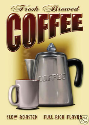 Mike Patrick - Fresh Brewed Coffee Metal sign 16 3/4" X 11 3/4" - holes punched in each corner with folded edges