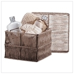 Lightly scented “Pure Pleasures Vanilla Milk” bath set comes in an artfully rustic cord box. Gel, lotion, salts and more. |