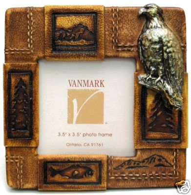 Images of the Outdoors: Accent Frame - A wonderful accent frame from Vanmark! This 6'' x 6'' resin frame has the look of stitched and stamped leather, giving it a rustic, outdoor feel. The photo opening is for a 3.5'' x 3.5'' picture. The easel & back are covered in velveteen and there is a latched opening for photo placement. Gift boxed.