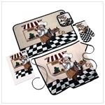 Coordinating kitchen accessories feature a light-hearted print of a plump chef dancing with glee in front of the village grocery, his glass of red wine at the ready. Includes: apron, floor mat, towel, oven mitt and pot holder. |