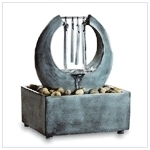 Water flows gently over tiny chimes down to polished river stones, creating sounds of serenity in this sound-activated “Zen”-shaped fountain. |