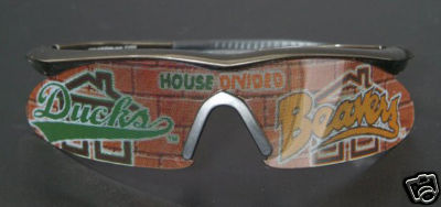 New from Sportsuperstoreusa.com / Teamfansonline.com, Officially licensed House Divided Ducks/ Beavers Sunglasses. The sunglasses that reflect your team spirit! Featured in the new contemporary style blade design frames. You can see out but no one can see into the lenses! These sunglasses utilize a patented technology that integrated the image onto the lens during the manufacturing process of the lenses. They provide 100% UV protection from the suns harmful and damaging rays. Heavy duty frames and durable polycarbonate lenses. We currently have over 100 NCAA Colleges and Universities as well as the MLB. Your order will be processed and shipped immediately upon verification of payment from PayPal. With our PayPal account we can accept payment even if you don't have an account with PayPal. Thanks for your business!