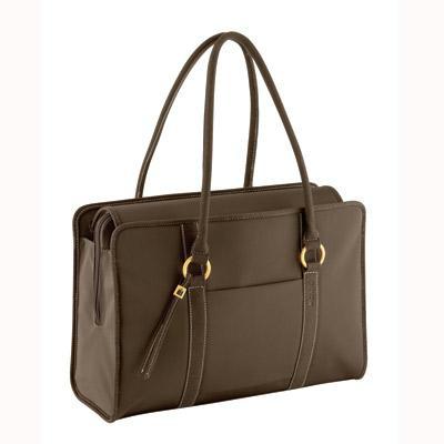 Microfiber portfolio holds a 15.4" laptop. Double feature flap. Exterior front pocket. Two additional compartments organize files and personal essentials. Separate cord/ cosmetic case.