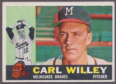 This is a 1960 Topps Card of Milwaukee Braves P Carl Willey. VG/EX, Crease Free, clean back, Buyer pays $2.00 first card, $1.00 second card, .25 each additional card. Two or more cards shipped in a bubble mailer. Thanks.