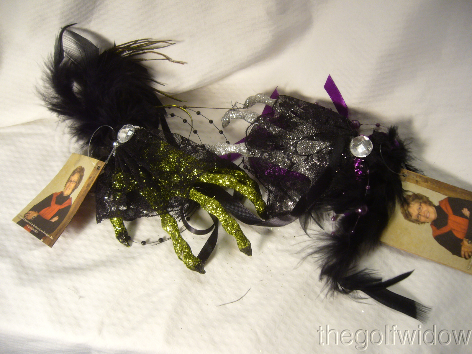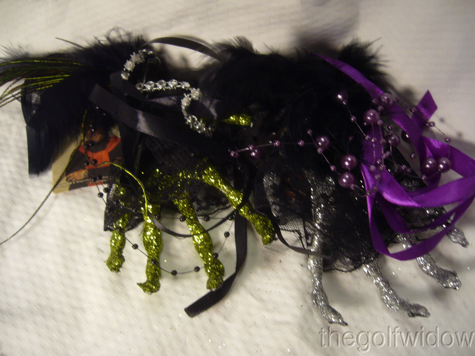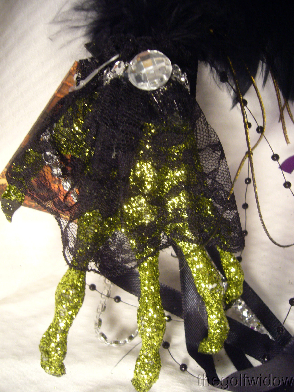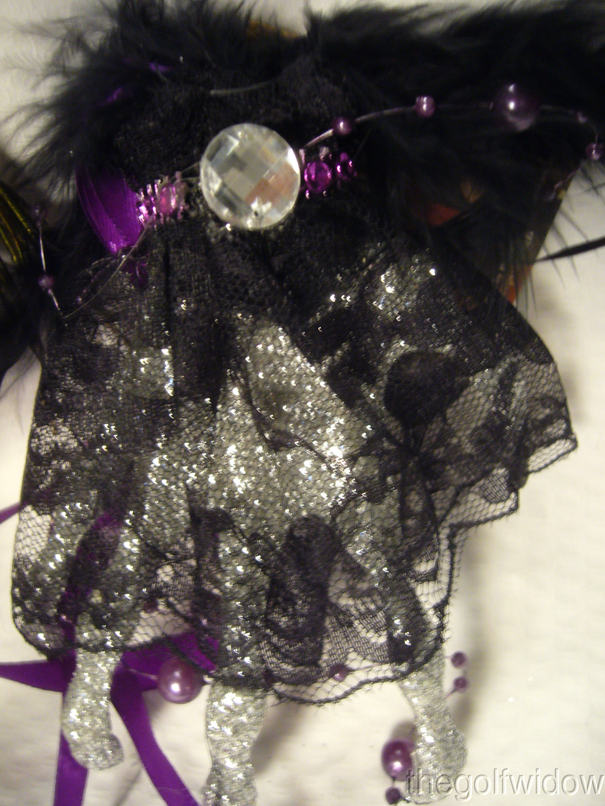 - Glitter Covered Plastic with Feathers and Ribbon and Beads