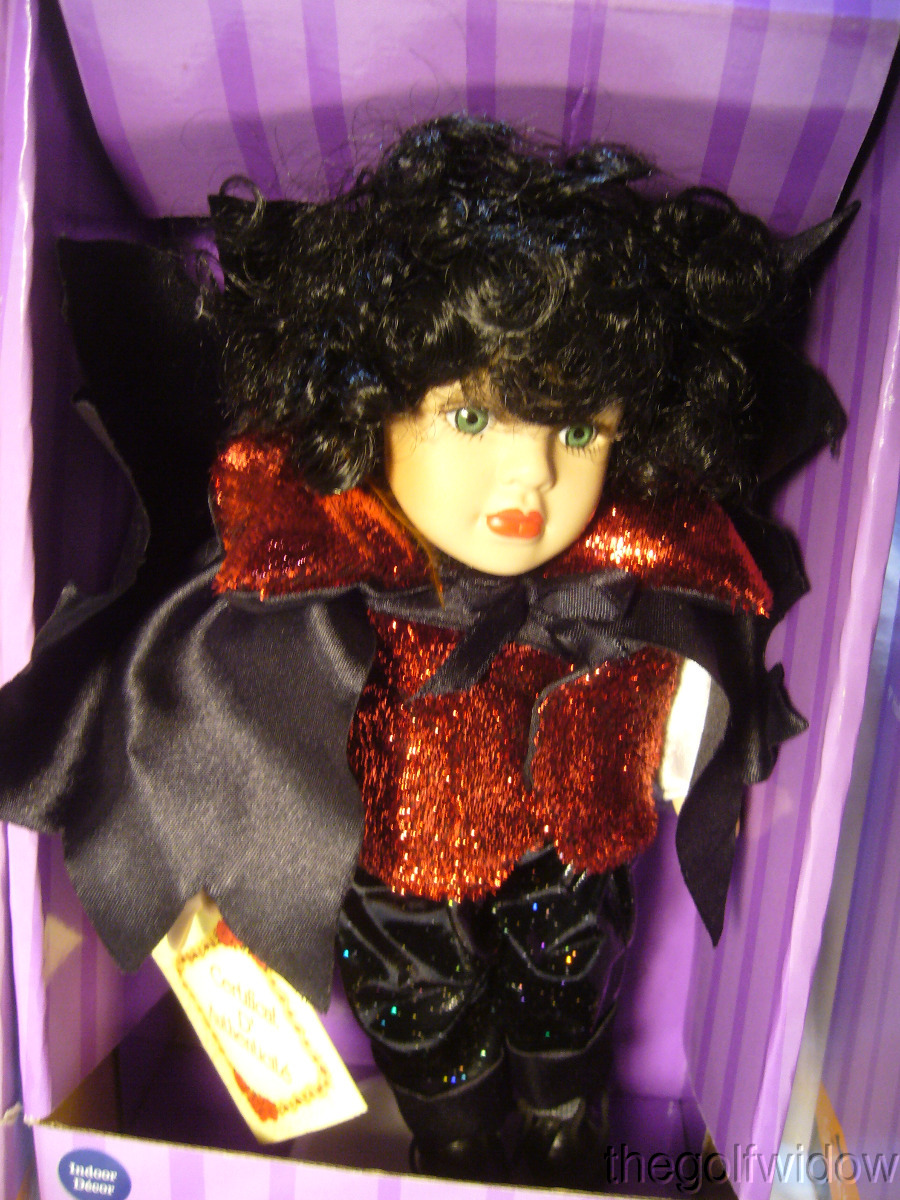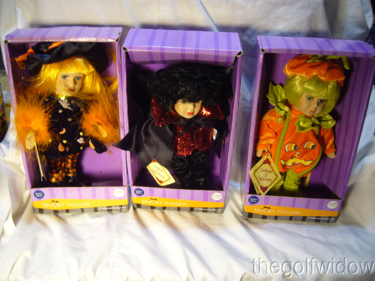 Three Spooky Hollow Halloween 9 Inch Porcelain Dolls Witch, Pumpkin and Bat
