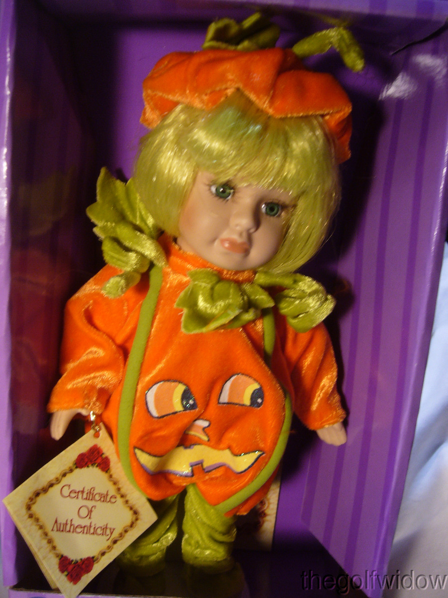 ​Three Spooky Hollow Halloween 9 Inch Porcelain Dolls Witch, Pumpkin and Bat - Three Halloween Themed Dolls